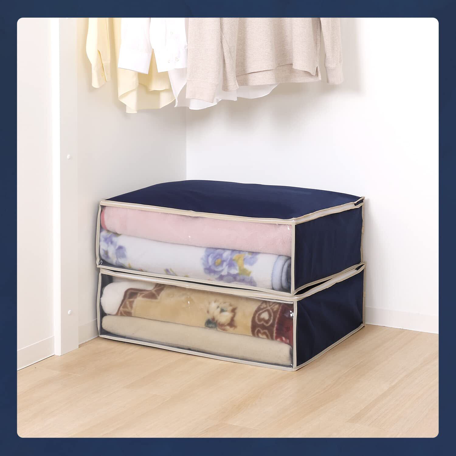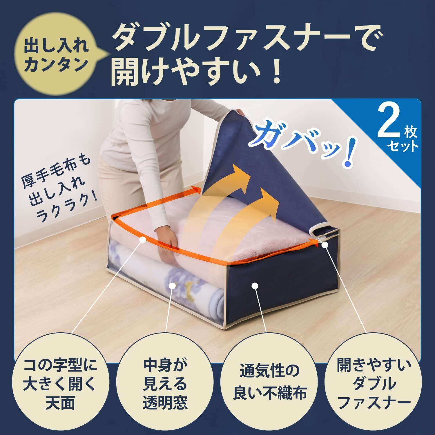【商品仕様】:サイズ/約幅70×奥行53×高さ23cm、カラー/ネイビー、内容/2枚、収納目安/厚手毛布約2枚(袋1枚あたり)、材質/ポリプロピレン、ポリエチレン
