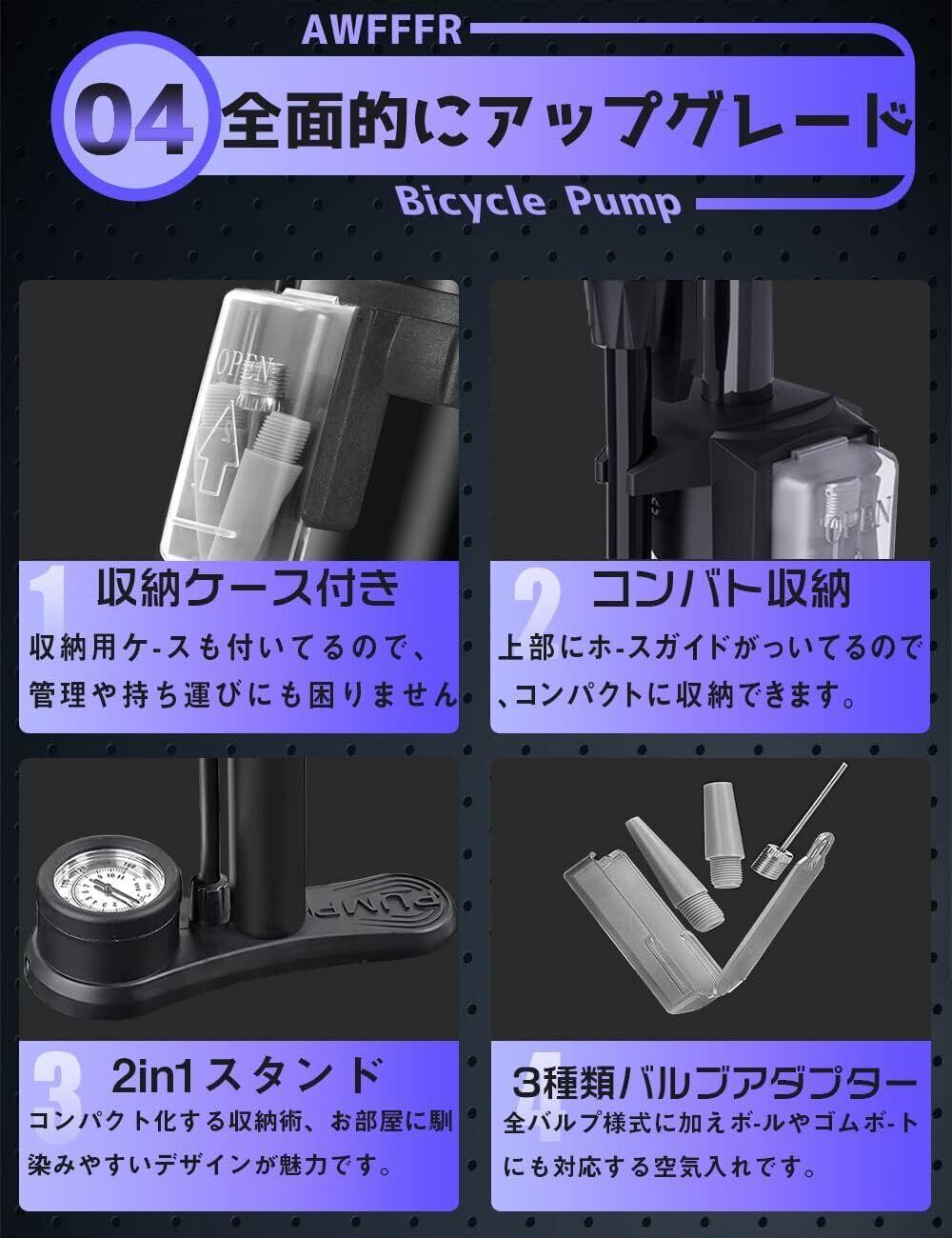 【2022 設計強化 空気入れ】空気圧は最大11Bar/160PSIでほとんどの自転車にご使用できます。押しても引いてもエアーが充填できて少ないポンピングで空気を入れる事が可能。ロードバイクやスポーツバイクに使用するなら「エアゲージつき」。ードバイクやクロスバイクなど、本格的な自転車に空気を入れるなら「エアゲージつき」の空気入れを使用しましょう。2in1スタンド、少ないスペースを有効活用しよう。ボールや浮き輪へのくうきいれにもお使いいただける3種類のニードル付き。