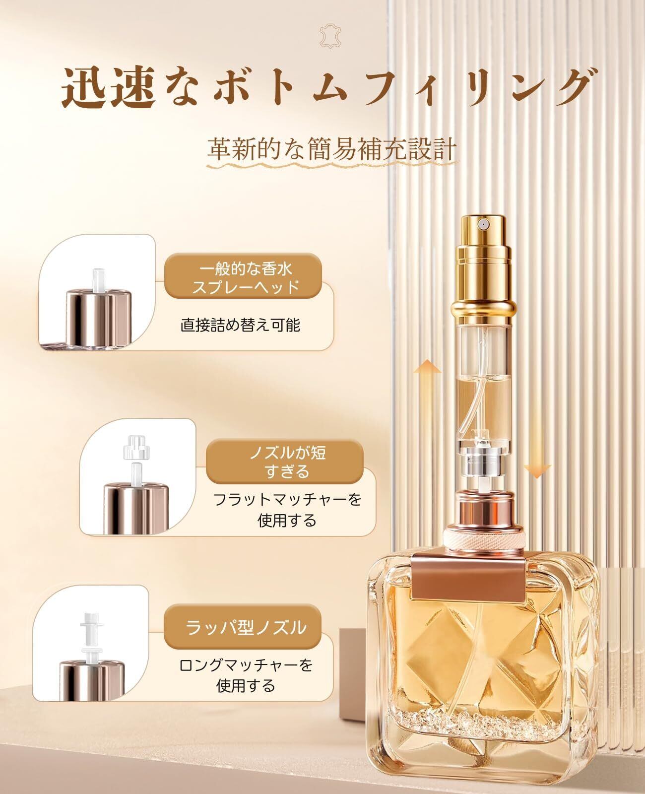 【ワンタッチ補充・底部充填設計】革新的な底部充填機能により、香水の補充が簡単でスムーズに行えます。漏斗や工具は不要で、ボトルを外す手間もなく、数秒で詰め替えが完了します。忙しい朝にも最適です。