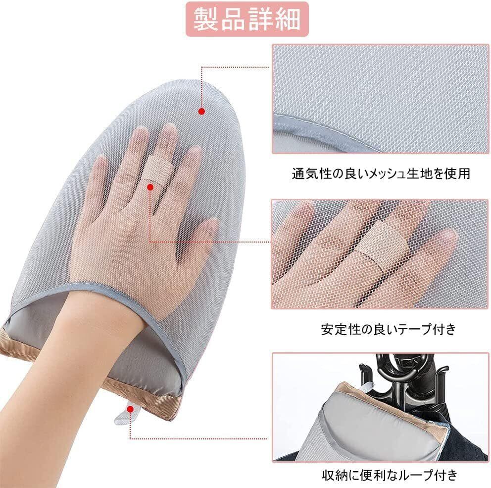 【使用方法】手につける事ができるアイロンミトン。手に装着するため、場所も取らず、自由に角度を調整しながら細部までアイロンをかけることができる。指を通すと安定性の良い中指用テープ付で、左右両用です。