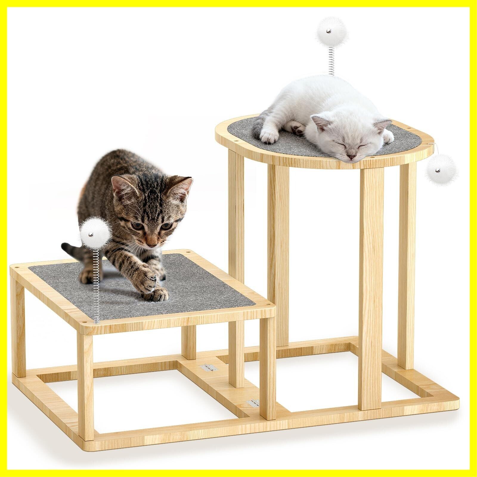 「2段式キャットタワー」 この木製キャットタワーは、下段が長方形・上段が楕円形の2段構造で、愛猫が登ったりくつろいだりするのに最適です。商品全体のサイズは約L64×W42×H43cmであまりスペースを取らず部屋の隅っこに据え置きができて、子猫から成猫まで快適に利用可能。高さのある上段は愛猫の好奇心を刺激し、下段は安定感のある設計です。