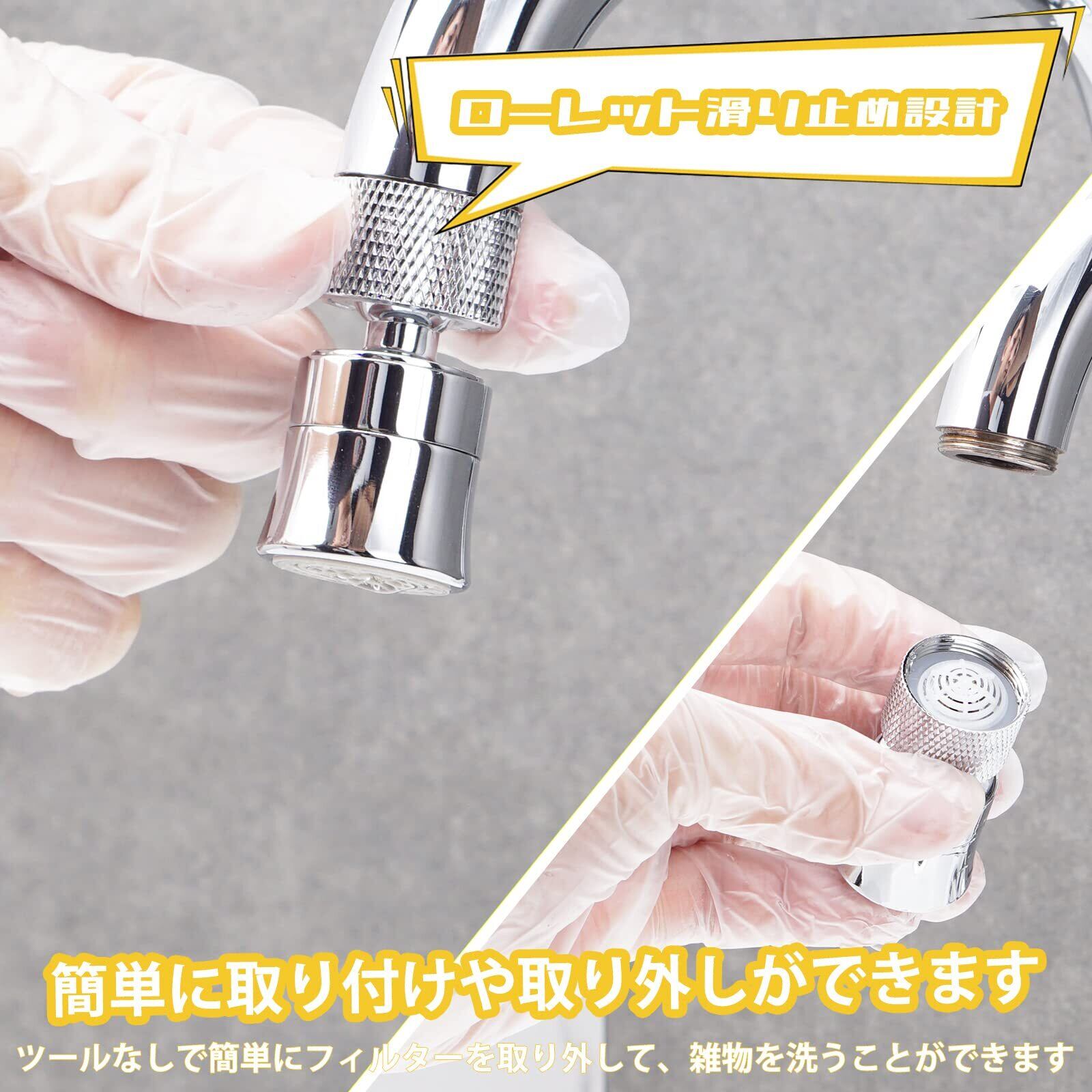 「取付けと取り外しが簡単」5種類のアダプータと防水部品を含んでいて大多数の蛇口に適応して、ローレット滑り止め設計、ツールなしで簡単にフィルターを取り外してフィルター中の雑物を洗うことができます