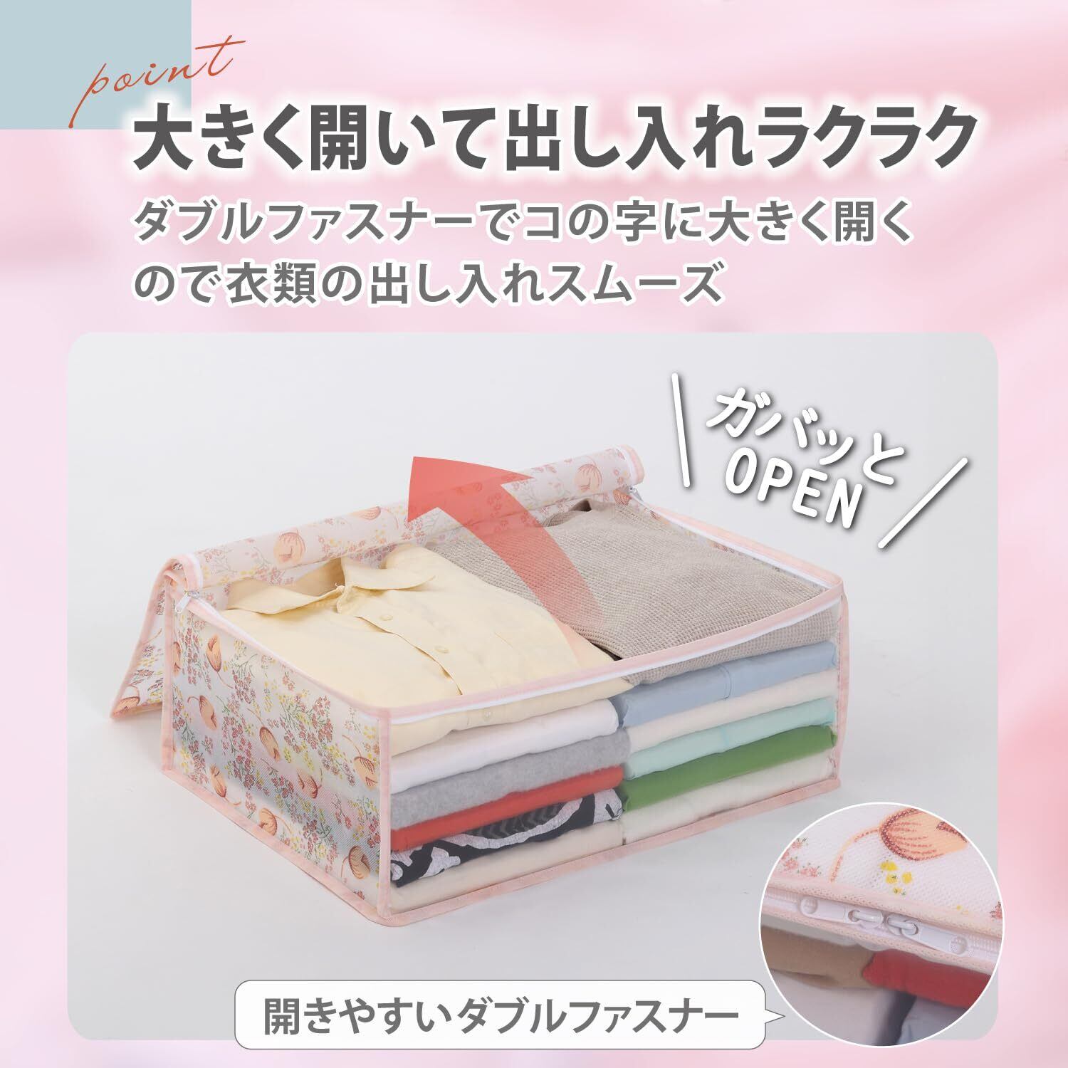 【透明窓付き・出し入れしやすい】:前面は全てクリア素材になっているので、収納したまま中身の確認ができる。コの字ダブルジップファスナーで3辺が開くので、衣類の出し入れがスムーズ。