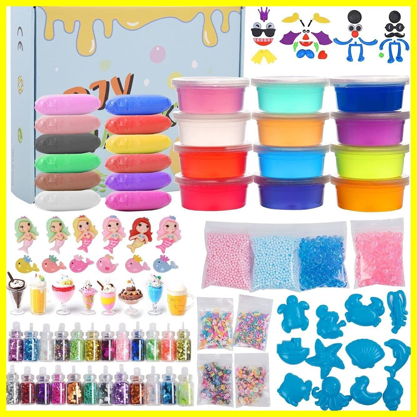 【盛り沢山の豪華スライムキット】女の子と男の子向け超豪華なエプロン付きスライムキットが登場!24色ガラス瓶スパンコール 、12色スライム、12個の軟質粘土、2パックの金魚鉢飾りビーズ 、2パックの発泡スチロールビーズ、4色装飾品(ランダムな形状)、12個モールドを使って 、9個小さいプラスチックワイングラス 、3個ツール、面白パーツセット(36ウィジェットが含まれています)、12個装飾品(美人魚...等)