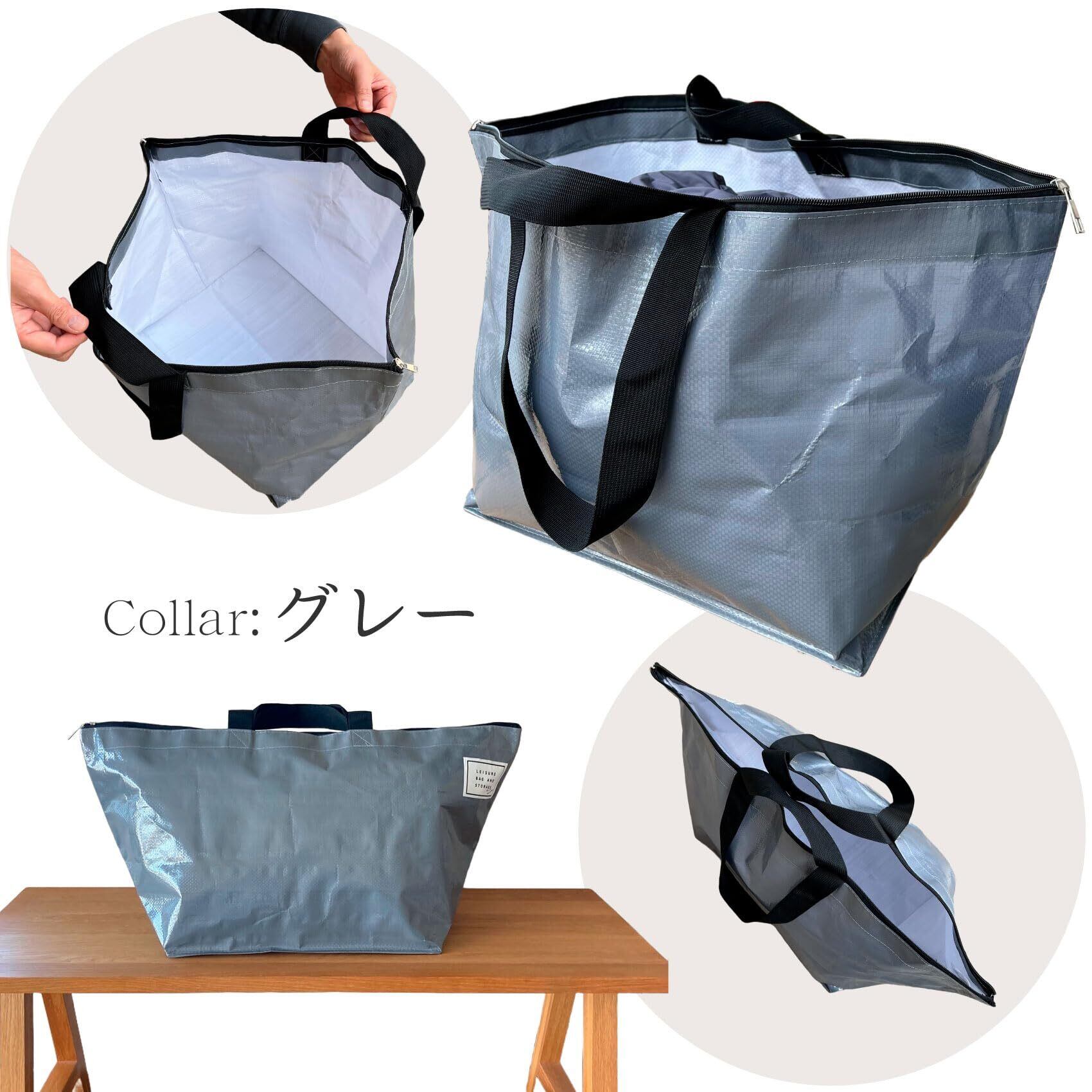 レジャーバッグ ボストンバッグ 大容量 コインランドリー ファスナータイプ 自立 折りたたみ 軽量 ビッグ (グレー)