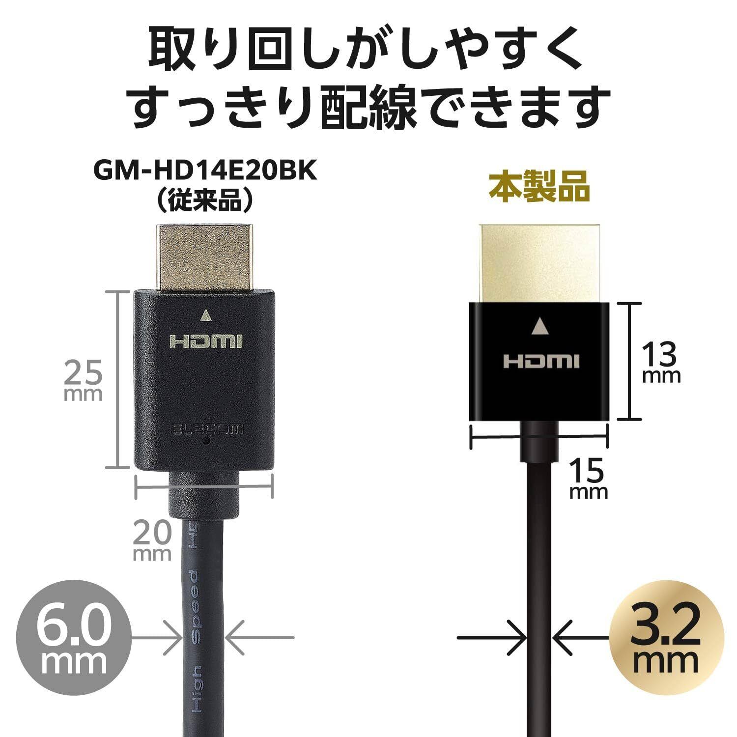 ■ ケーブル直径約3.2mmで取り回しがしやすく、すっきり配線できる、スーパースリムタイプのイーサネット対応ハイスピードHDMIケーブルです。