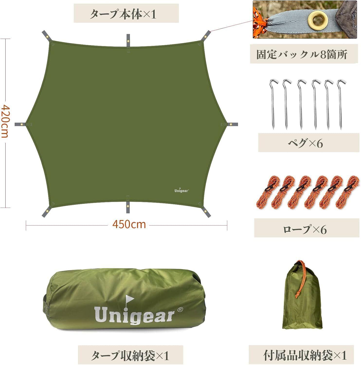 Unigear 防水タープ ヘキサ 紫外線対策 UVカット 撥水加工 軽量 遮熱性 収納ケース付き 持ち運び便利 アーミーグリーン