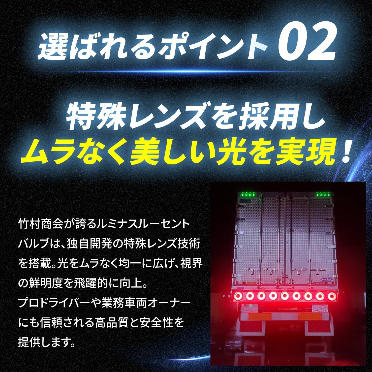 【特殊レンズを採用しムラなく美しい光を実現】 竹村商会が誇るルミナスルーセントバルブは、独自開発の特殊レンズ技術を搭載。 光をムラなく均一に広げ、視界の鮮明度を飛躍的に向上。プロドライバーや業務車両オーナーにも信頼される高品質と安全性を提供します。