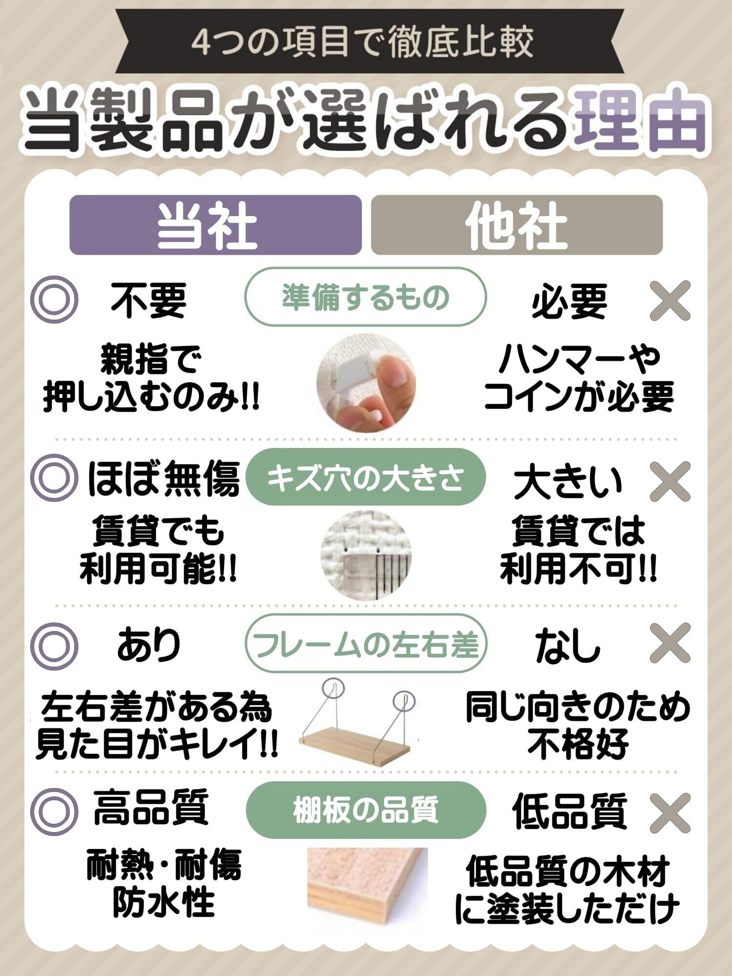 【製品の特長】《事前準備の必要なし》ピンフックを使用する場合は、ドライバーなどの工具もいりません。《壁はほぼ無傷》棚を設置した際のキズはほとんど残りません、ほぼ無傷です。賃貸物件にも◎《落下を徹底防止》落下防止ガードが付属しているのは当店のみ!《フレームの左右差》棚を丁度真正面から見たときにバランス良く、美しく見えます。
