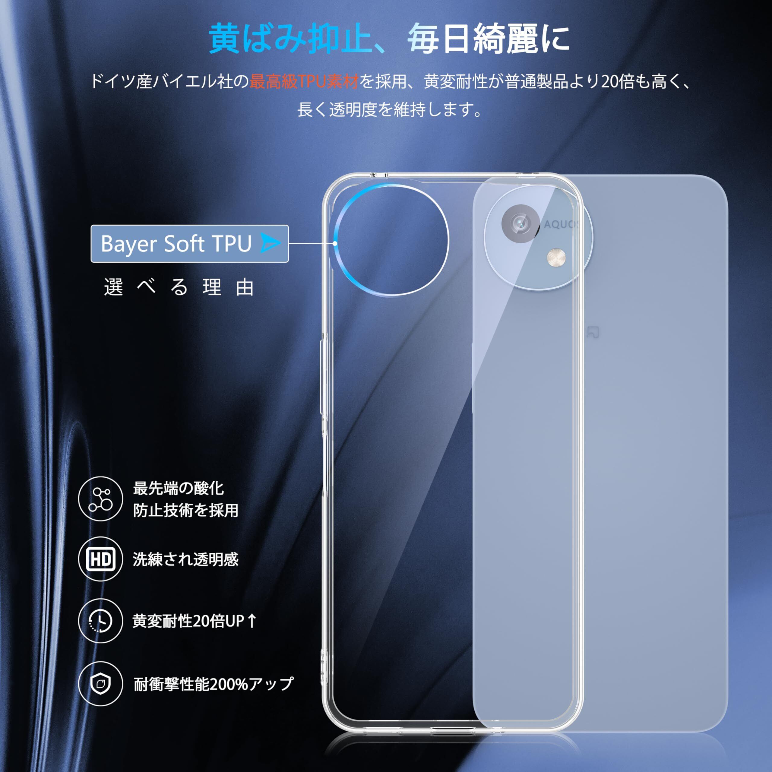 √【驚くほどの透明感&黄変防止】新先端テクノロジーADM(Anti discoloration material)をTPUに採用。黄変耐性が普通製品より20倍も高く、長く透明度を維持できます。全面透明により、AQUOS wish4の美しさをそのまま楽しむことが出来ます。また、ケースの内側に施された吸着に優れるマイクロドットは熱を効率的に放出し、ガラス面の水にじみを防ぎます。