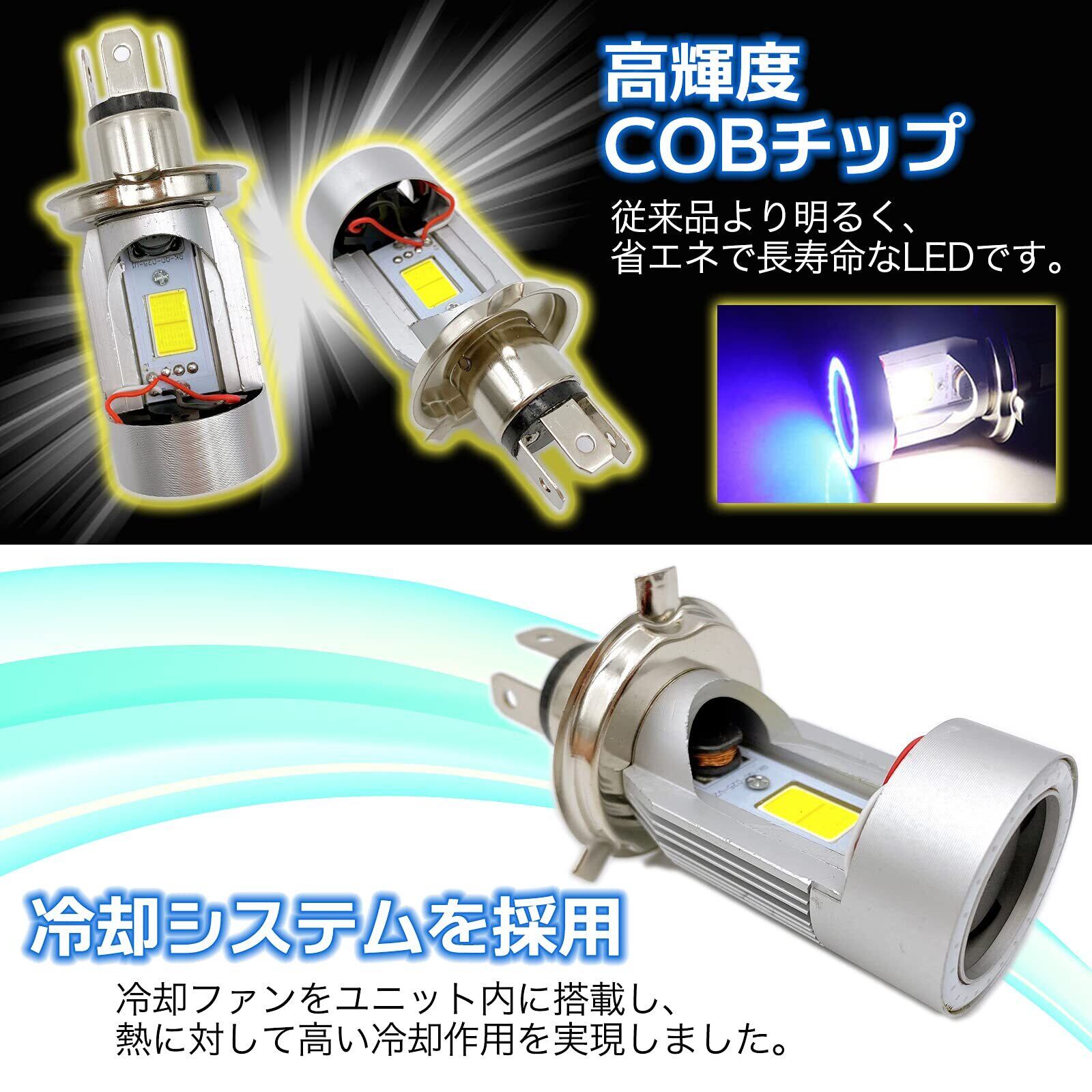 高輝度COB LEDチップを搭載した高速冷却ファン内蔵のH4 バイク用ヘッドライト(イカリング/エンジェルリング)です。