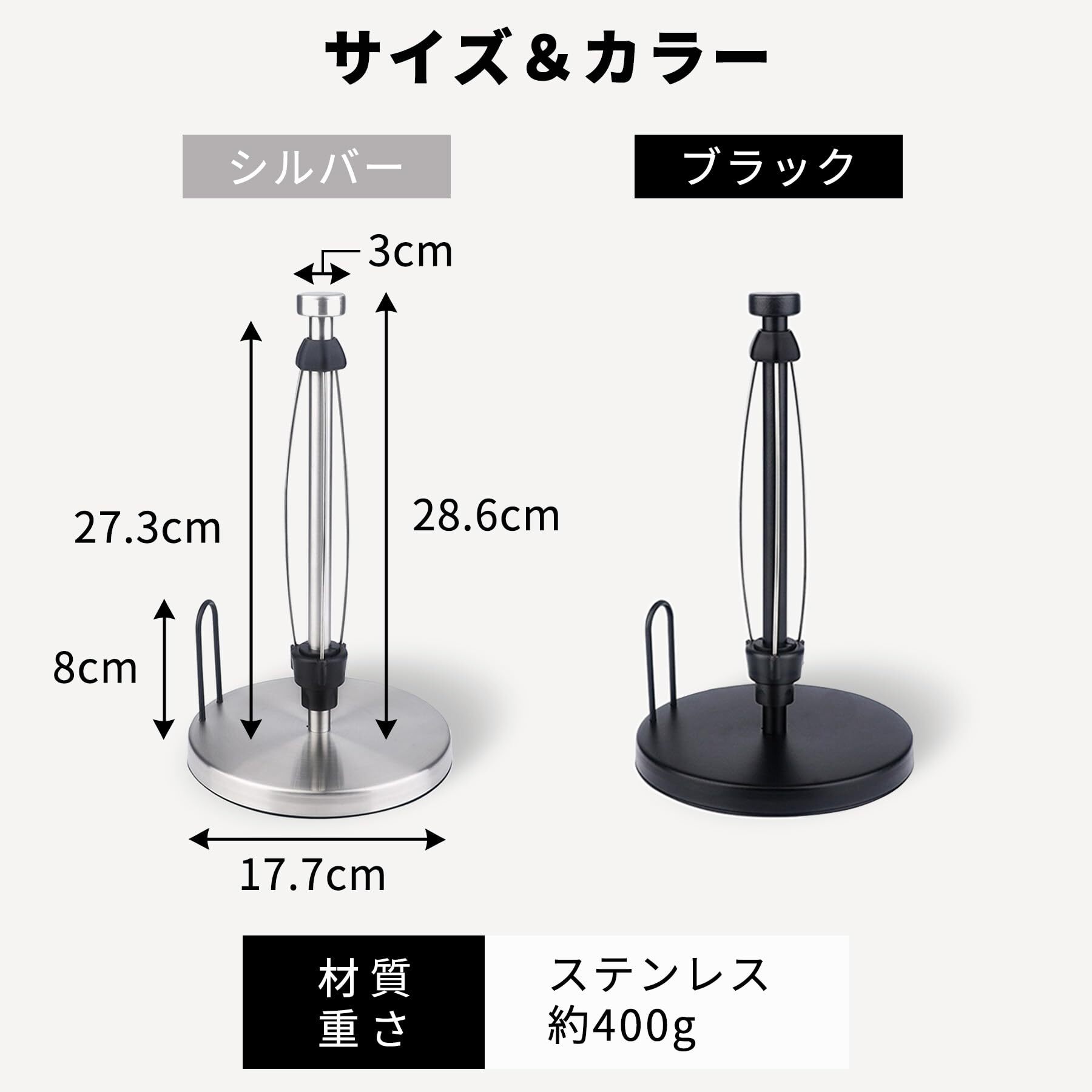 【製品情報】キッチンペーパーホルダー 素材:ステンレス製 カラー:ブラック・黒 シルバー・銀 サイズ:土台17.7㎝・高さ28.6㎝・中心3㎝ 重さ:約400g