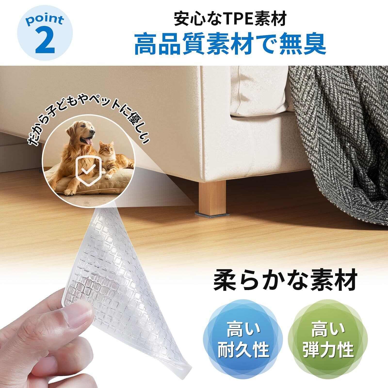 【特別設計で強力な滑り止め】 ソファー滑り止めシートは、家具用に特別に設計されています。角いデザインで、ソファーやベッドの脚にぴったりフィットし、安定した固定を提供します。床にスリップしないように保護し、騒音を効果的に軽減します。さらに、木製床面の傷つきを防ぎ、家の静かな環境を維持します。