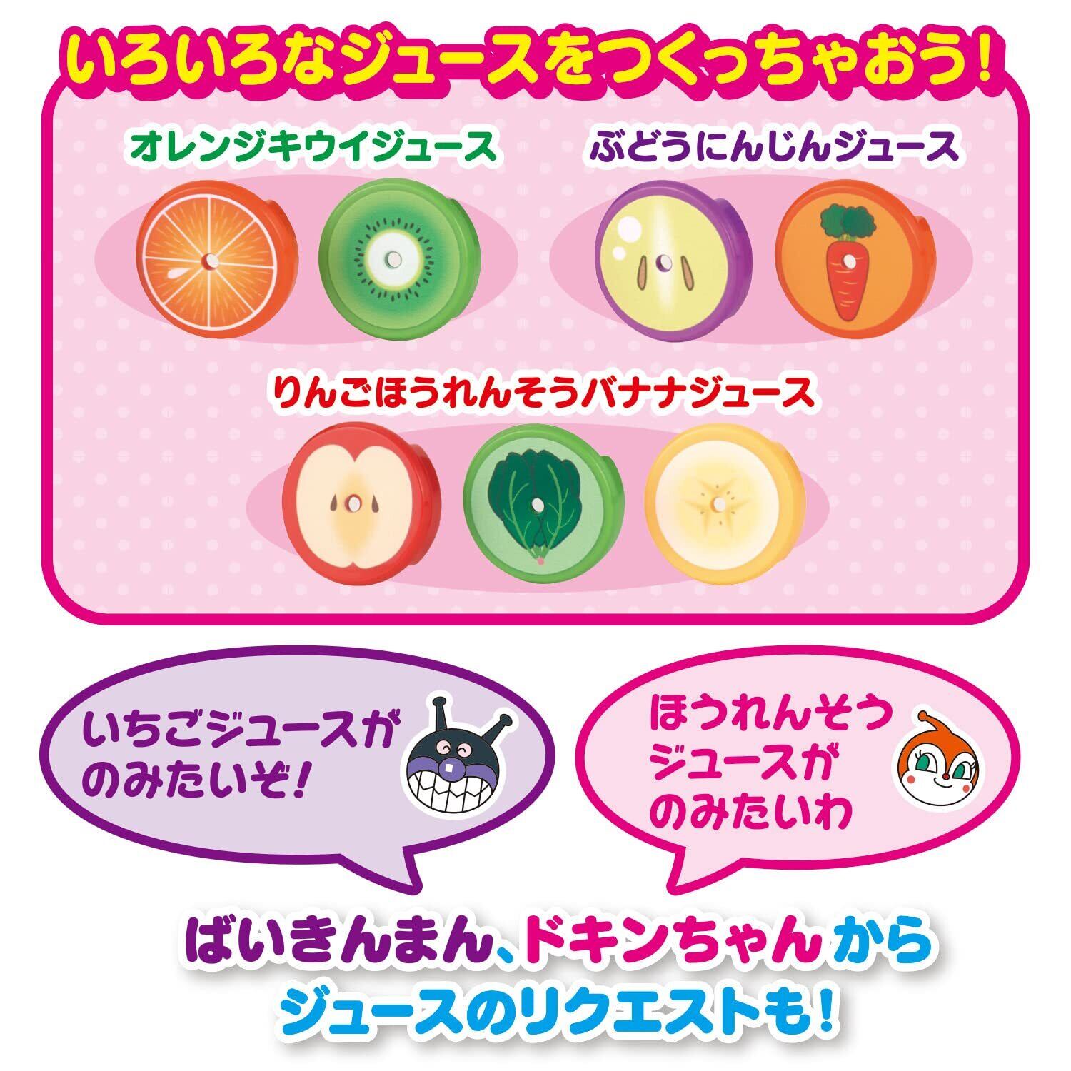 フルーツやおやさいをいれるとアンパンマンがなまえを読み上げ、本体が光ります!ボタンを押すと楽しい音楽とともに本体が回転し、ジューズづくりあそびが楽しめます。