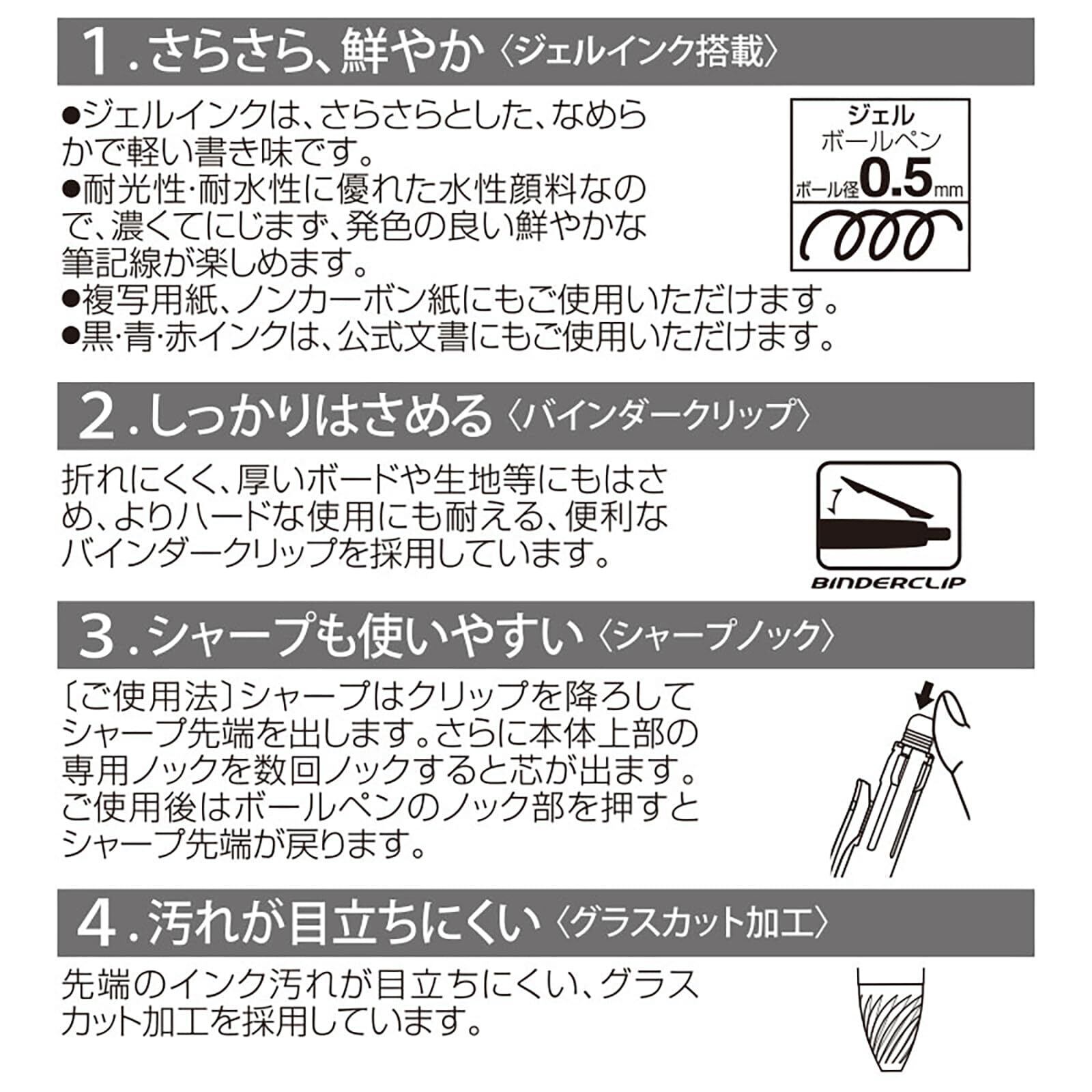 1本に4色のボールペンと、シャープペンの5機能を搭載。ボールペンはジェルインクで滑らかな書き心地。可動式バインダークリップは手帳やノートに挟みやすく、持ち歩きに便利。