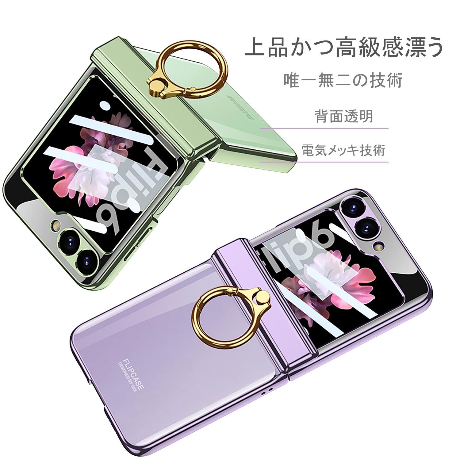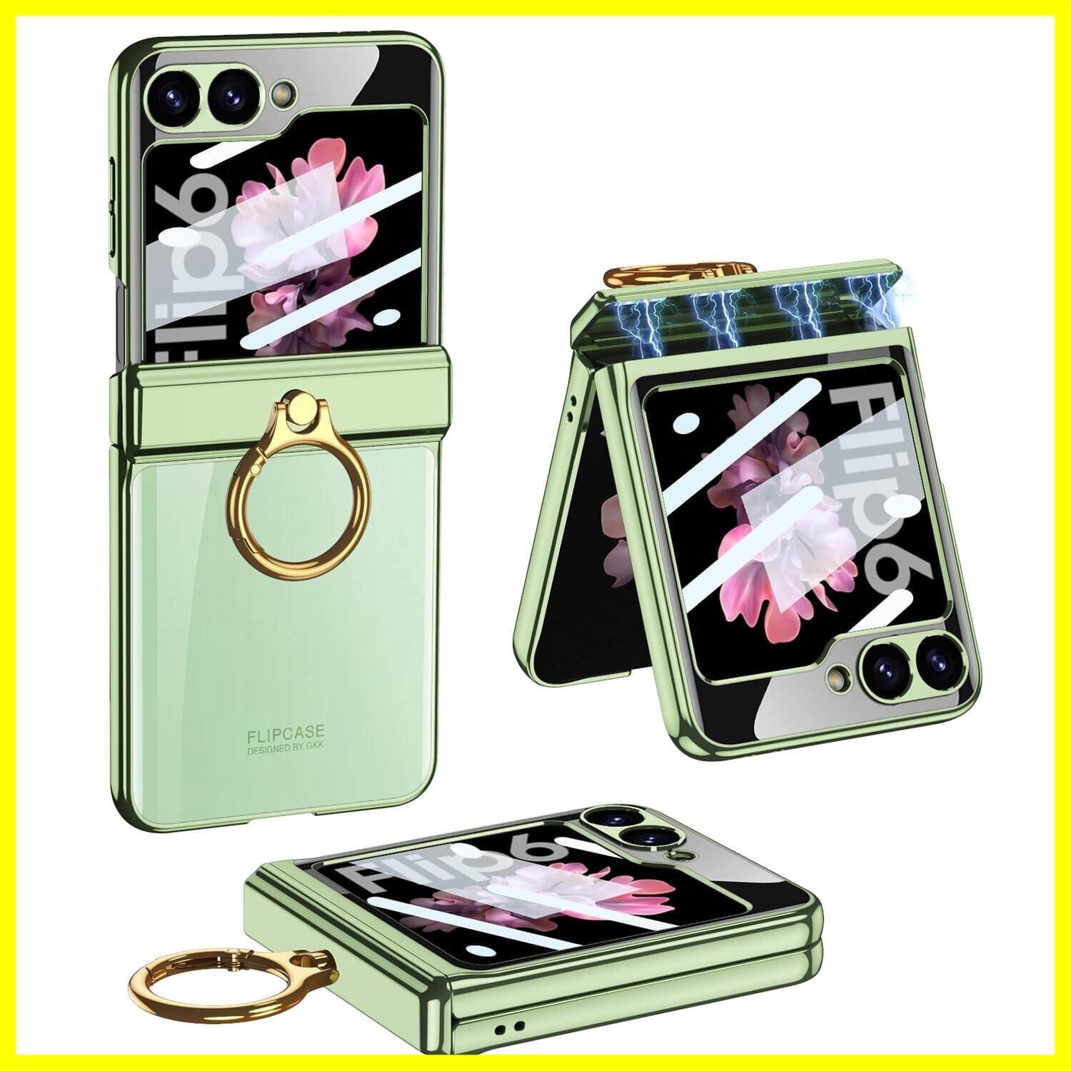 Galaxy Z Flip6 クリア ケース ヒンジ保護 Samsung ギャラクシーZ フリップ6 用 カバー リング付き スタンド機能 Uovon スマホケース 背面に保護フィルム付き ストラップ穴付き メッキ 超軽量 超薄型 おしゃれ · グリーン