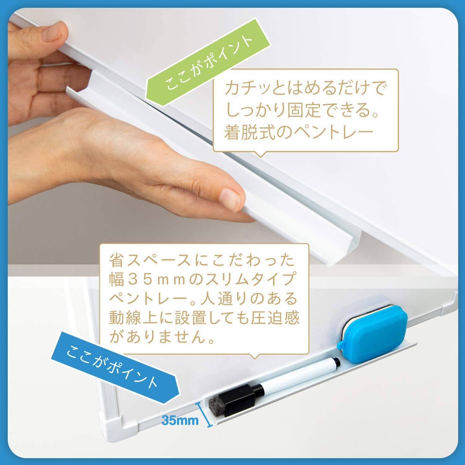 着脱式ペントレー、マーカーペン(黒)、イレーザー(マグネット付き)、マグネット4個を付属しているので、設置後すぐに使用することができる。