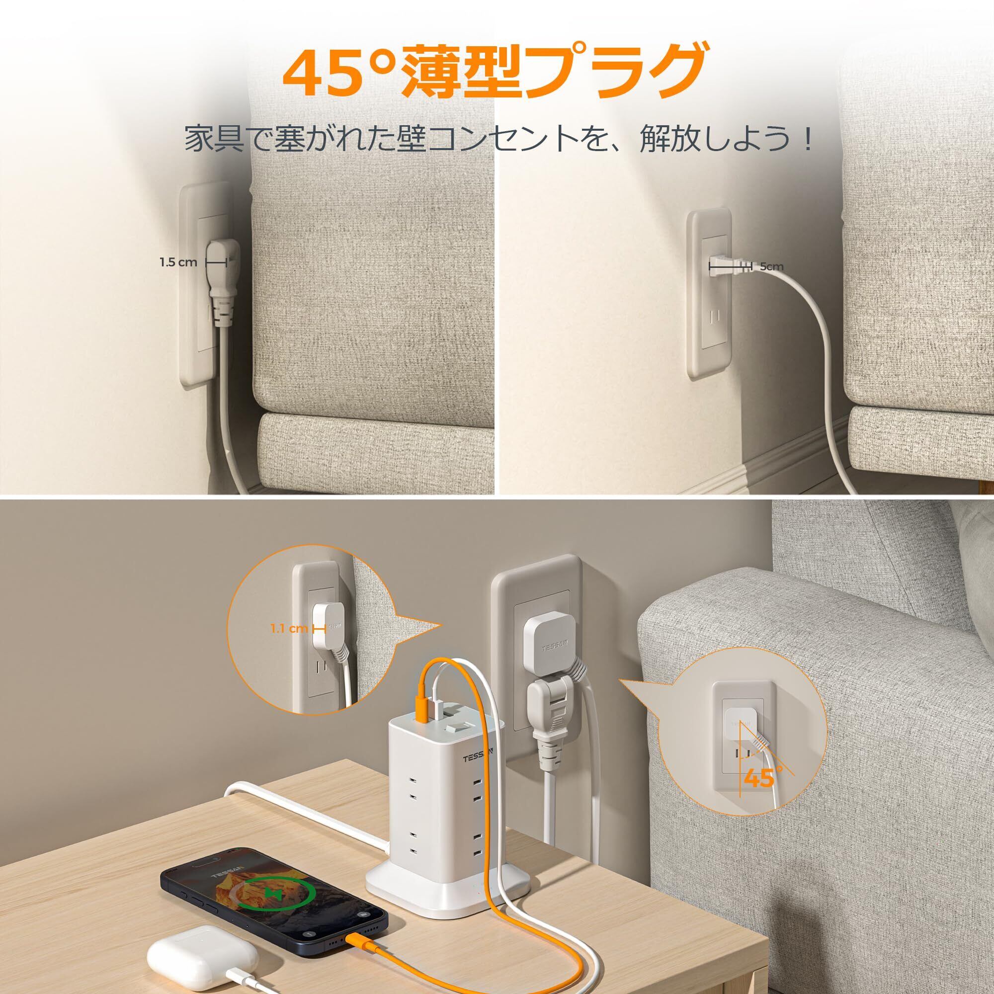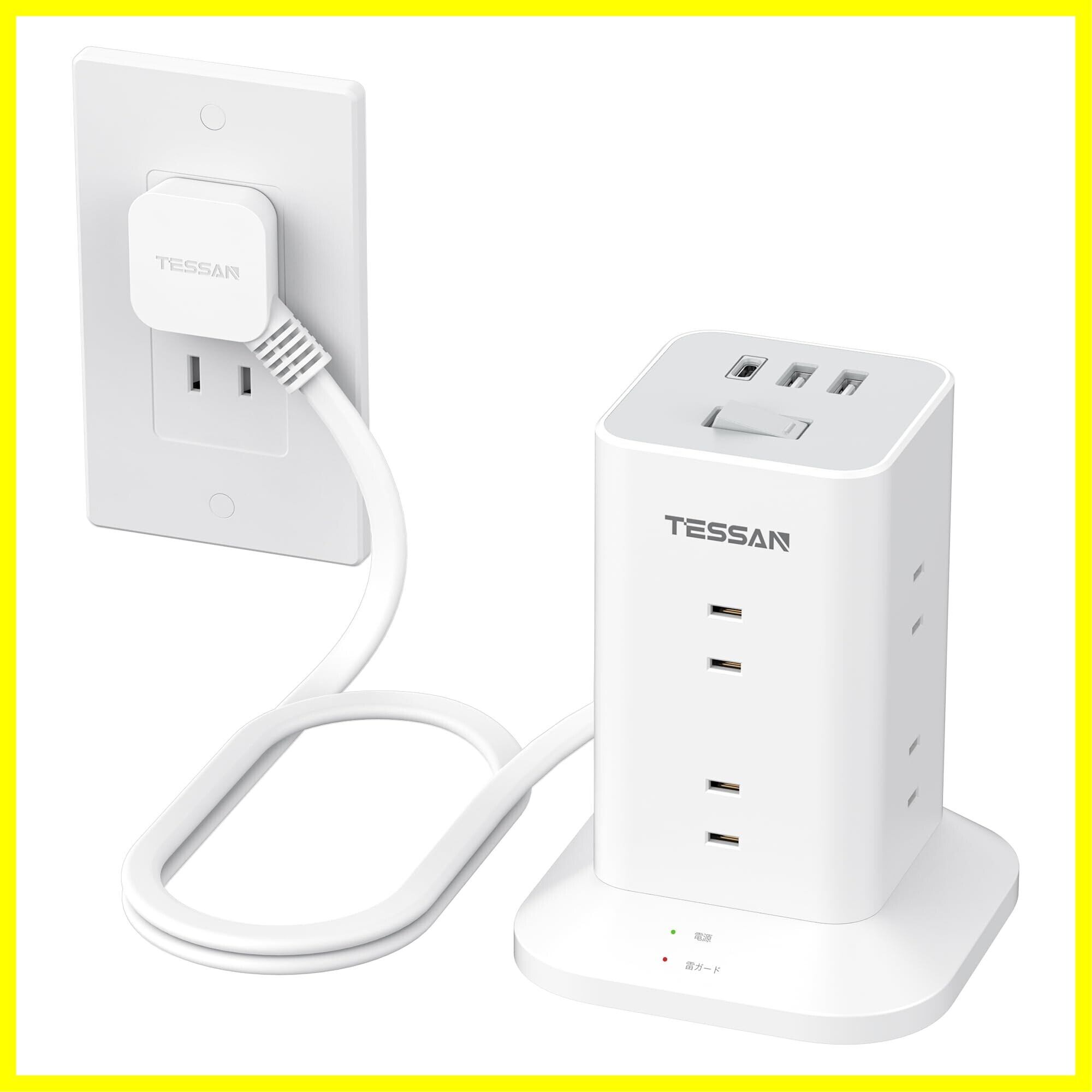 電源タップ タワー型 薄型プラグ 延長コード 1m 8個AC コンセント 3USBポート付き 180°スイングプラグ TESSAN テーブルタップ たこあしコンセント タコ足配線 マルチ OA 雷ガード 一括スイッチ 省エネ mini型