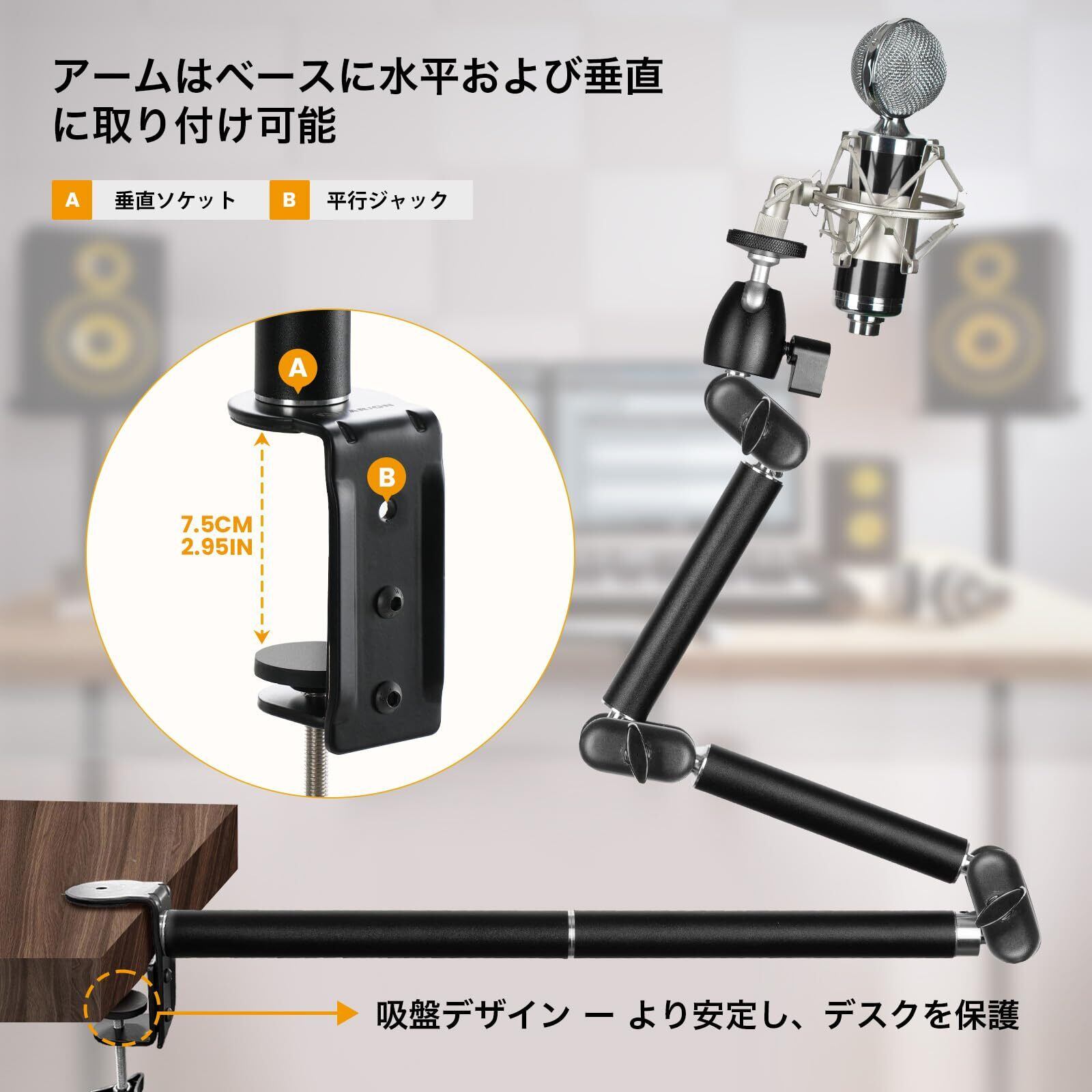 【汎用】カメラアームには3/8ネジが内蔵、雲台や一眼レフカメラなどに対応します。付属の3/8"→1/4"ネジアダプターで、1/4"ネジに変わり、ボールヘッド、カメラ、リングライト、Webカメラ、プロジェクターなど様々なデバイスと交換可能です。
