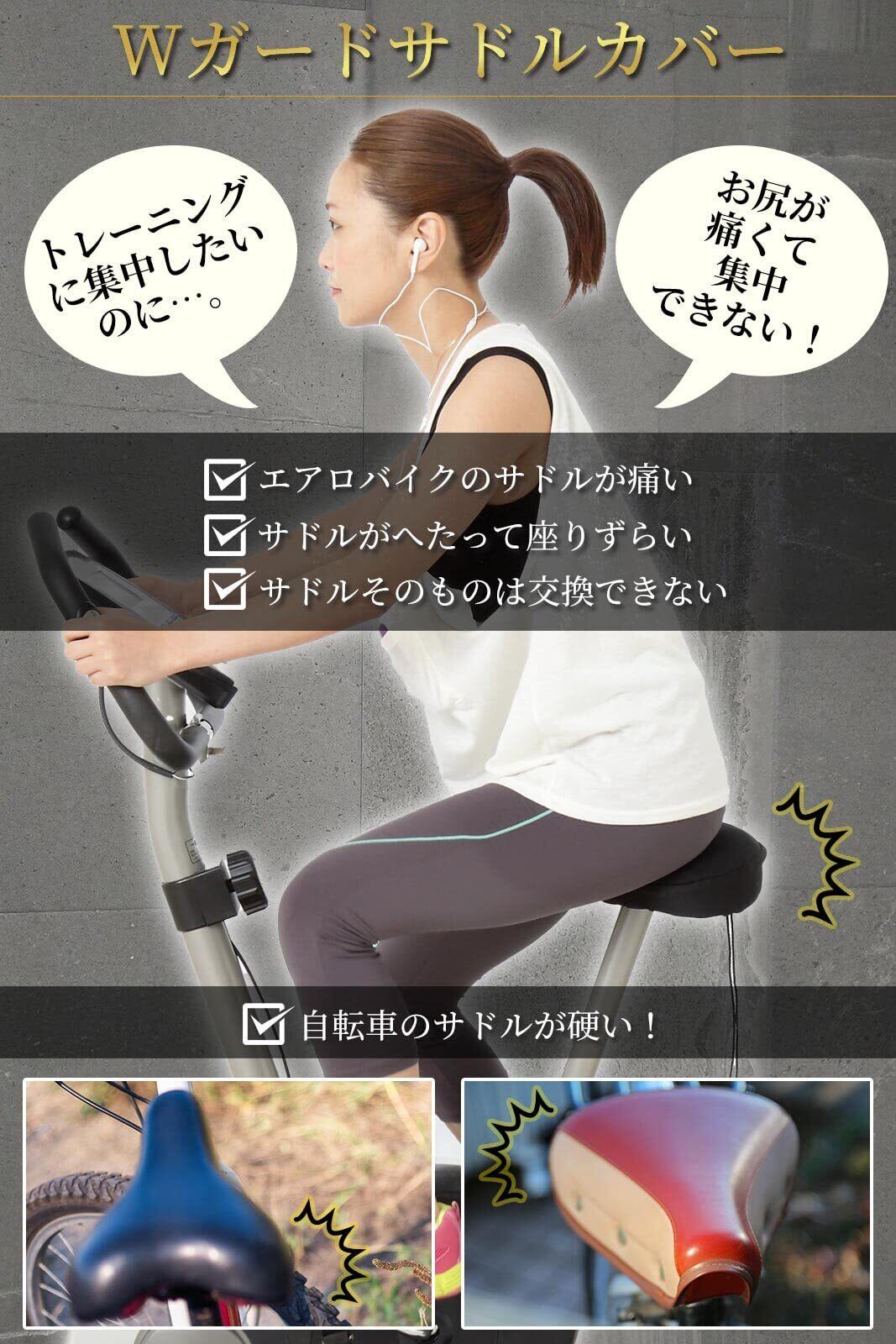 【■いろんなタイプの自転車やバイクに】エアロバイク・ママチャリ・クロスバイク・アシスト自転車などにぴったり。トレーニング・お子さまの送迎・お買い物・お出かけ・通勤・通学等で、日常的に自転車に乗る方におすすめです。超肉厚クッションが衝撃を吸収し、お尻の痛みを気にせず安全に乗ることができます。※横幅の狭いスポーツタイプのサドルにはご使用頂けません。