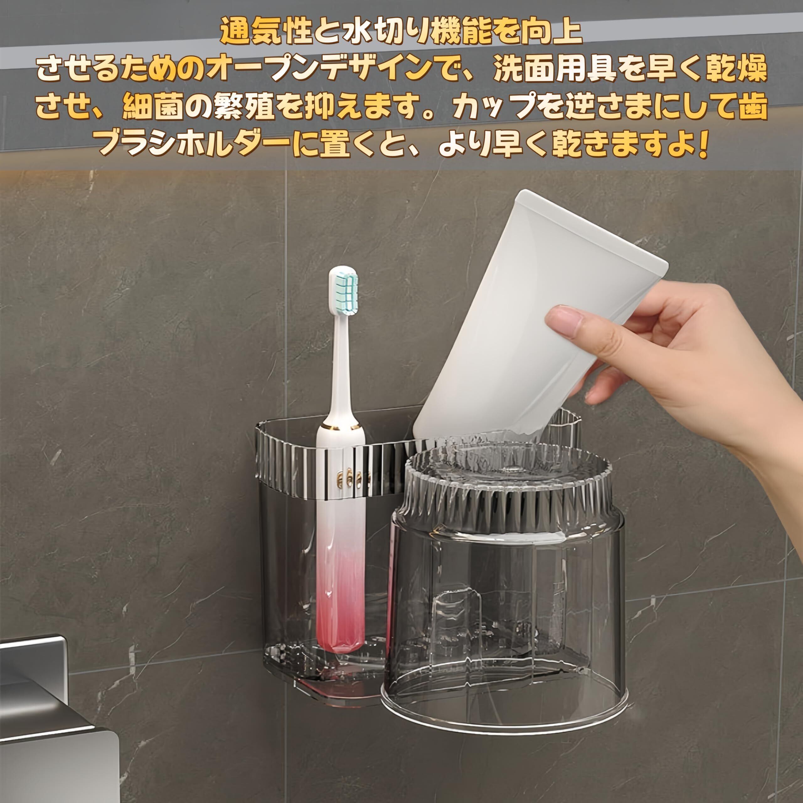 Jiawei歯ブラシホルダー うがいコップ 歯ブラシスタンド コップスタンド 歯ブラシ立て 穴あけ不要 大容量収納 歯磨きコップ 洗面所 コップ 浮かせるコップ納 透明 軽量 デザイン