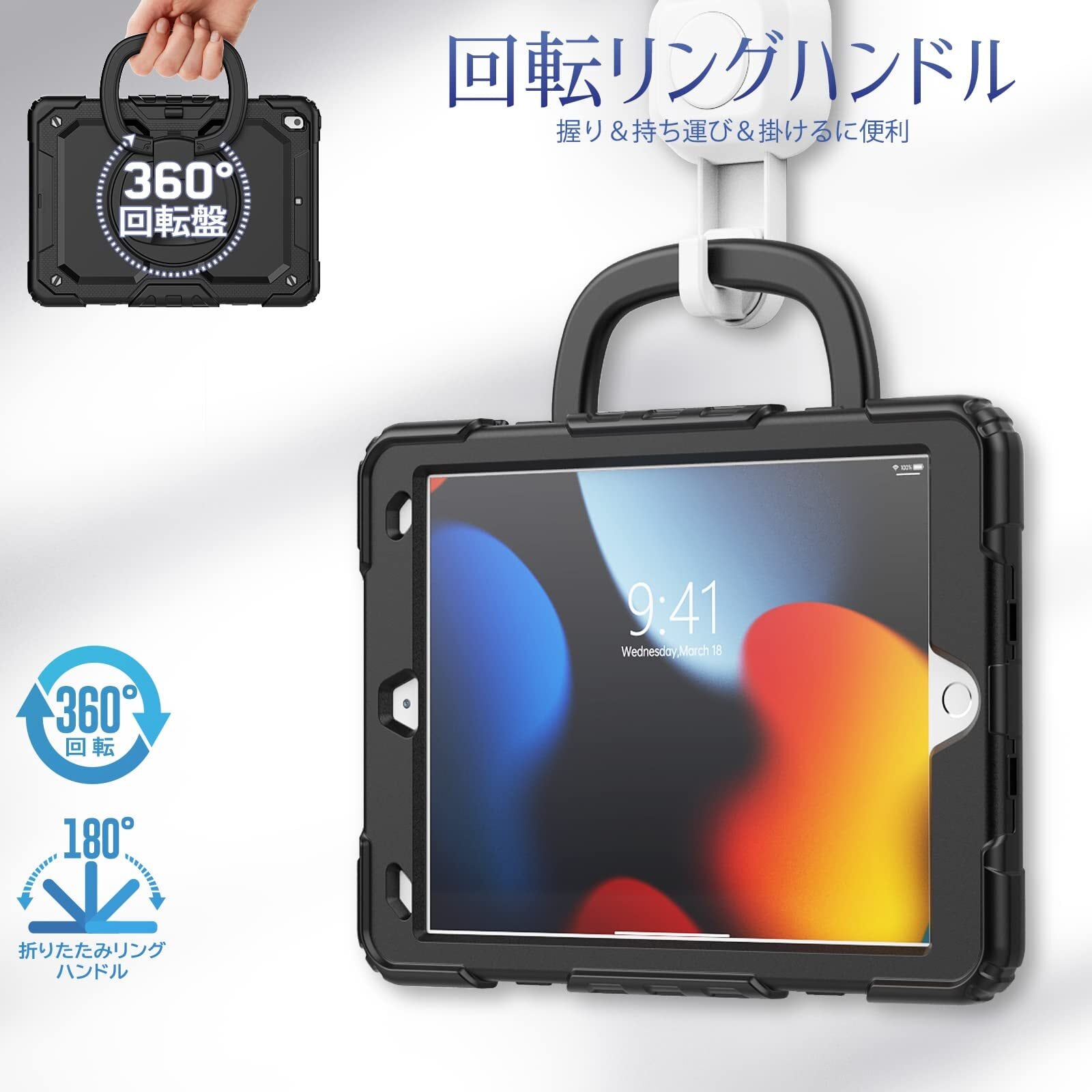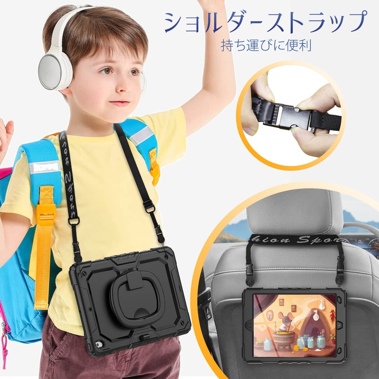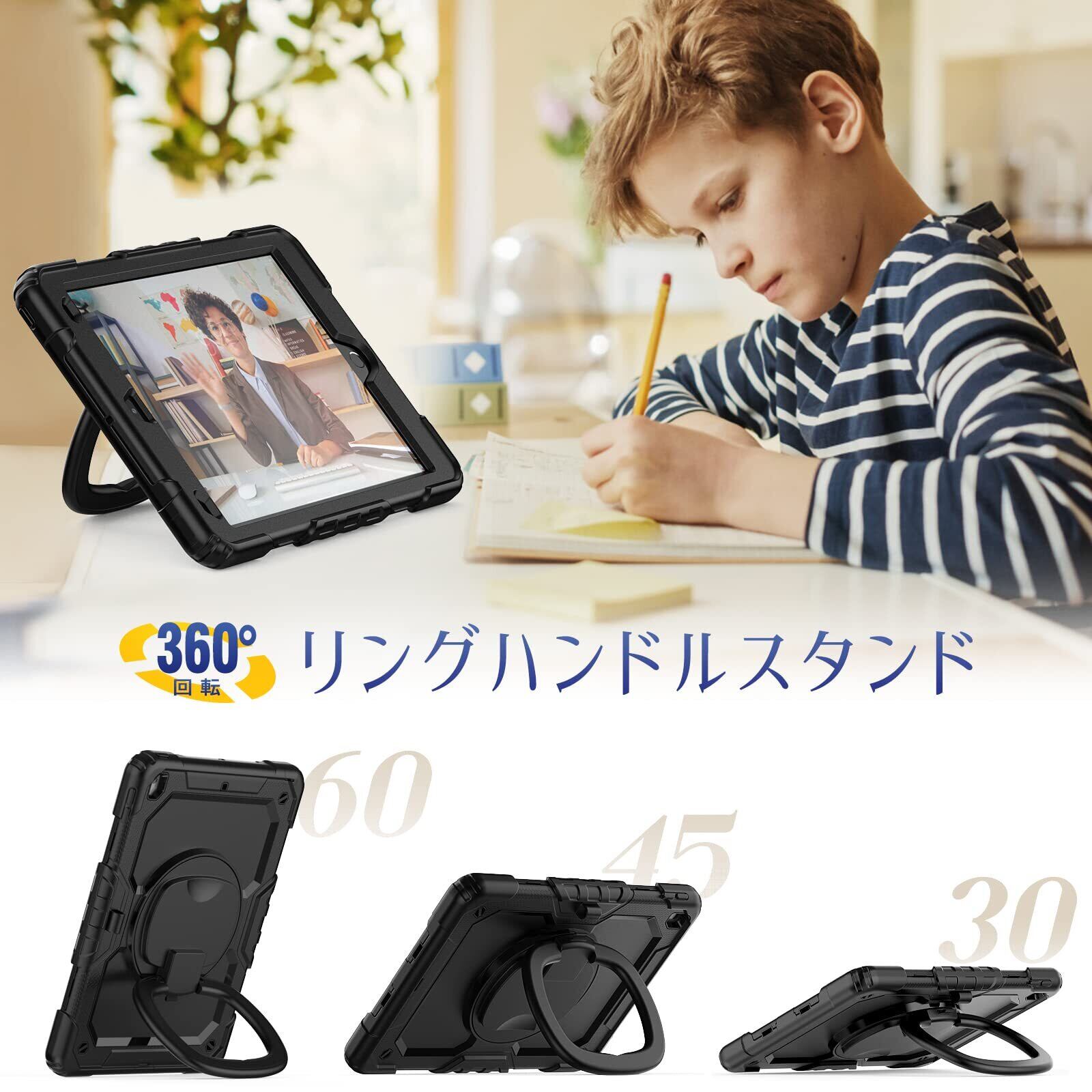 【360度回転リングハンドル】:どの場所、状況でも使いやすいリングハンドルは遊び、旅行中などに両手が自由になります。子供にもiPad 9/8/7世代 10.2インチが気楽に楽しめます。
