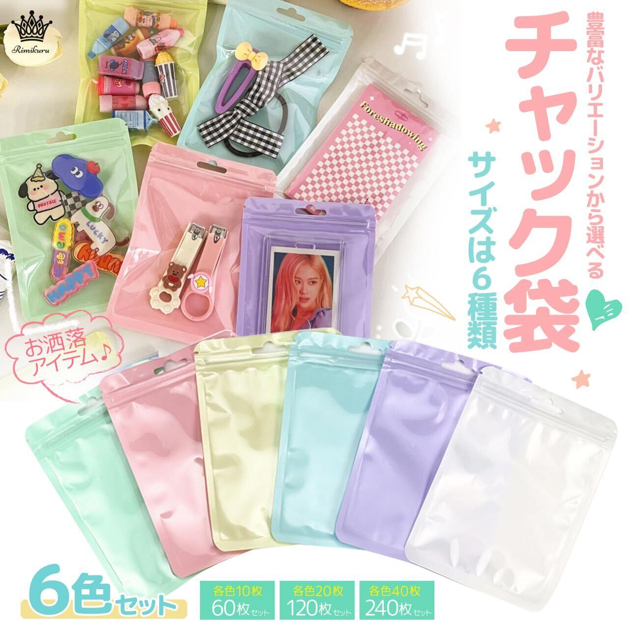 豊富なバリエーションから選べるチャック付き袋 6色セット:小物やアクセサリー等様々なものの小分け収納・ラッピングに便利なジッパー付き袋 カラフル(イエロー・パープル・ピンク・グリーン・ホワイト・ブルー) セットになっております。表面はクリアタイプなので中身も確認しやすく使い勝手の良い仕様になっております。6cm×10cm・7.5cm×10cm・8.5cm×13cm・9cm×12cm・9cm×16cm・10.5cm×15cmの6サイズそれぞれ60枚セット(イエロー・パープル・ピンク・グリーン・ホワイト・ブルー ×各10枚)、120枚セット(イエロー・パープル・ピンク・グリーン・ホワイト・ブルー ×各20枚)、240枚セット(イエロー・パープル・ピンク・グリーン・ホワイト・ブルー ×各40枚)をご用意いたしましたので、お好みや用途に合わせてお選びいただけます。