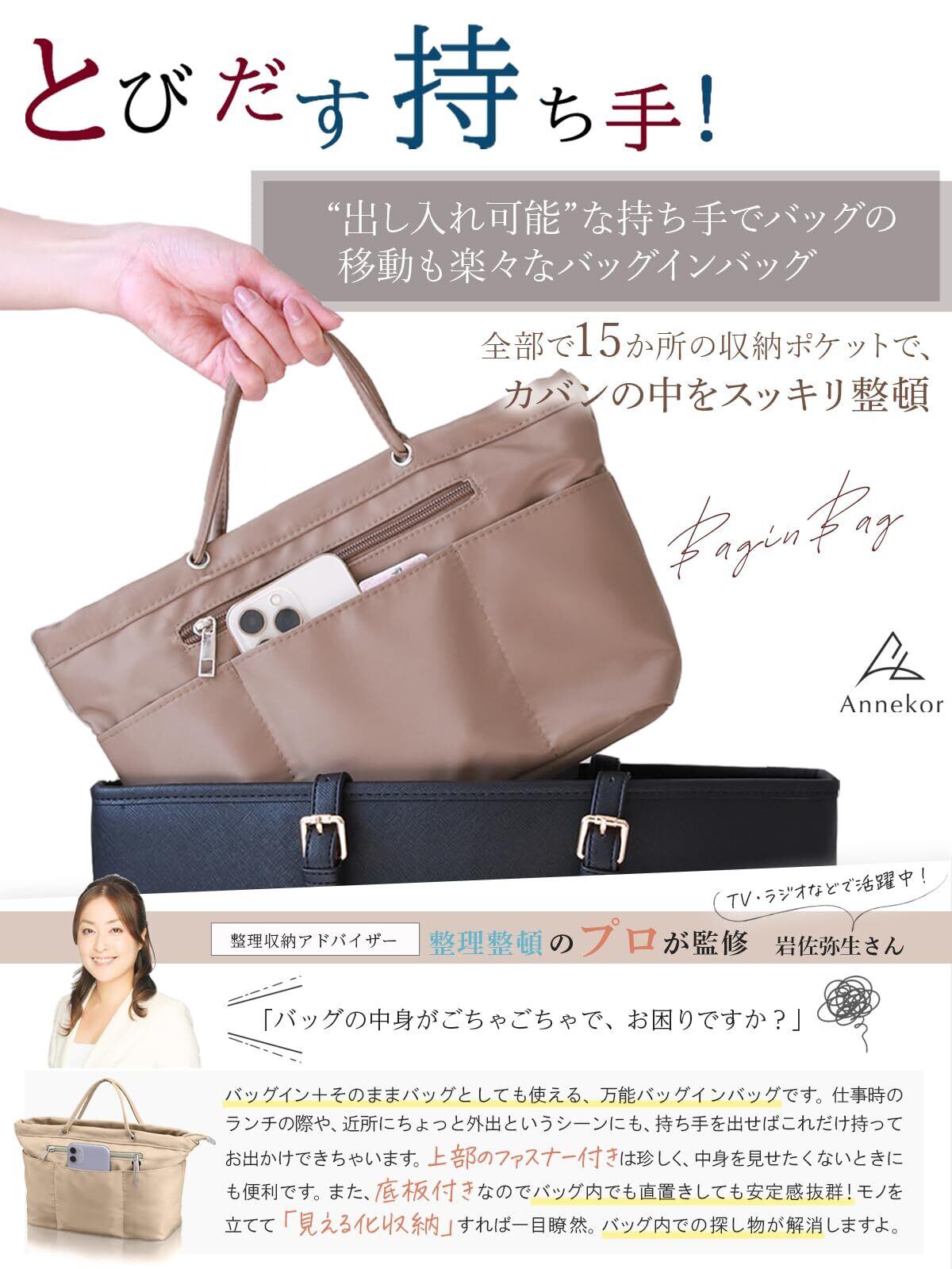 Annekor バッグインバッグ【新機能 とびだす持ち手】 バックインバック インナーバッグ 上質ナイロン 軽量 撥水 ポーチ インナーポーチ レディース メンズ [アンコール](モカ)