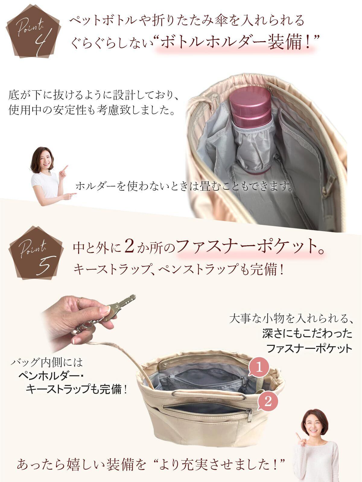 【とびだす持ち手付きバッグインバッグ】 累計2万個以上を販売した実績をもとに、お客様の声を反映した新機能「出し入れ可能な持ち手」付きバッグインバッグが誕生しました。使用しないときは持ち手を格納でき、必要なときだけ引き出せる仕様で、バッグの入れ替えがとても簡単になります。