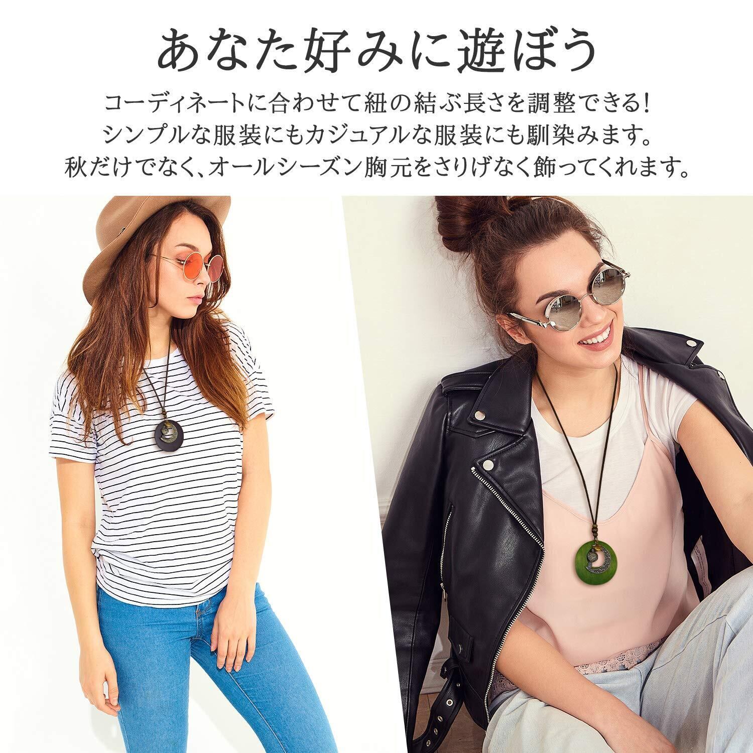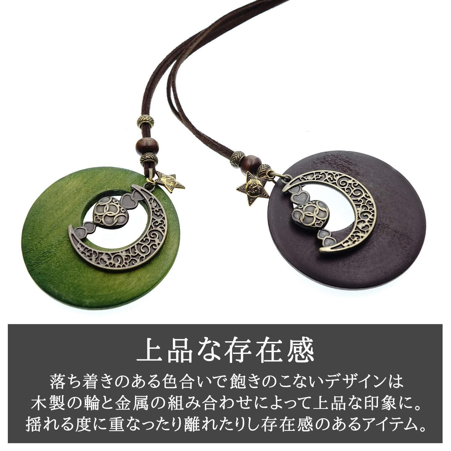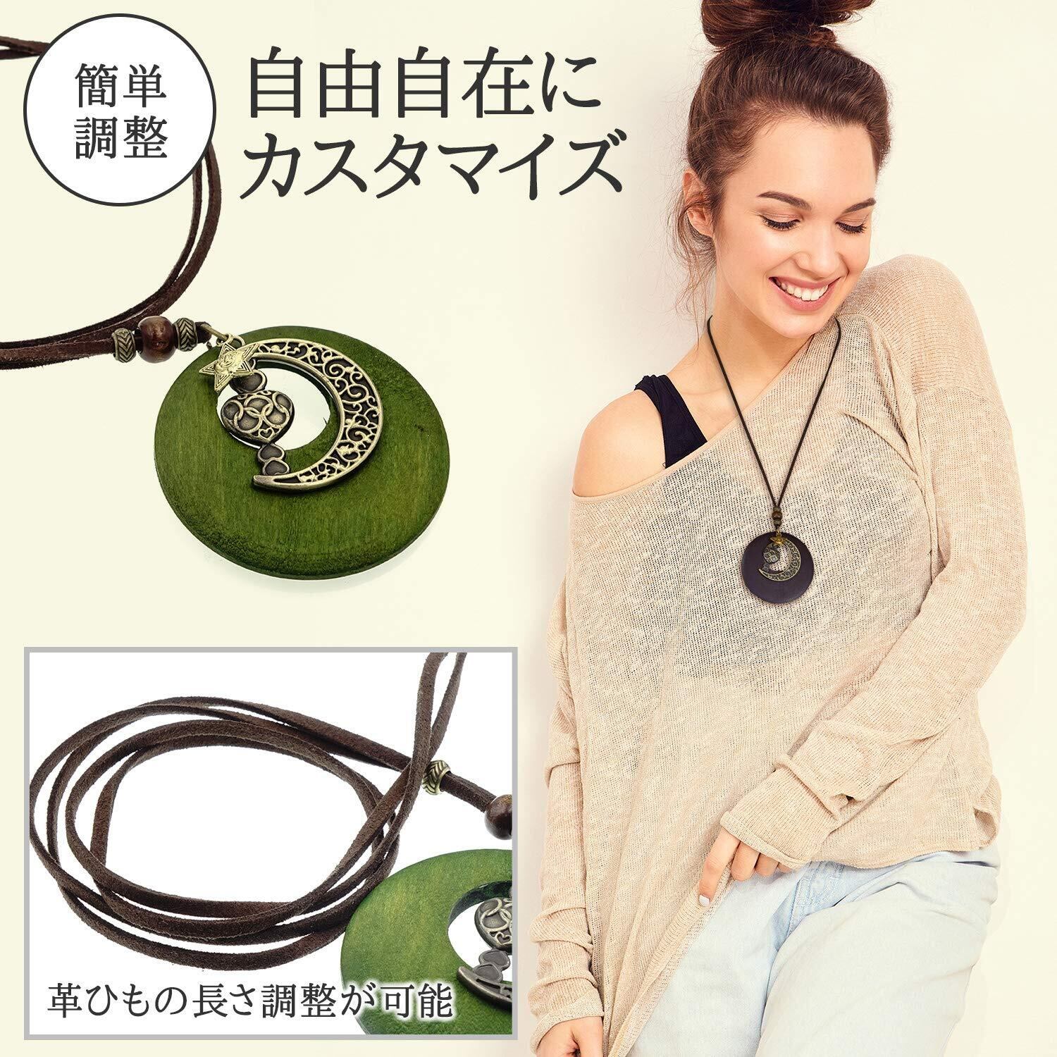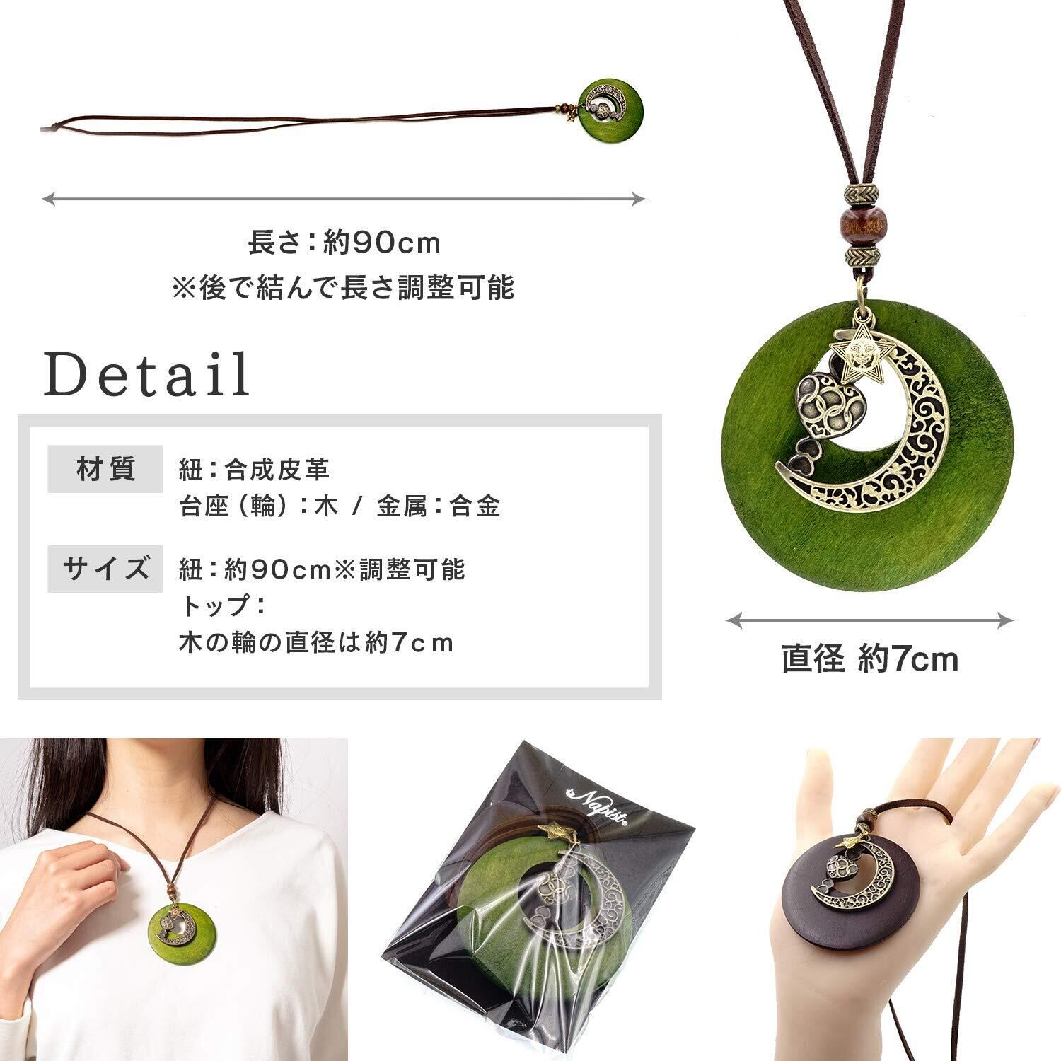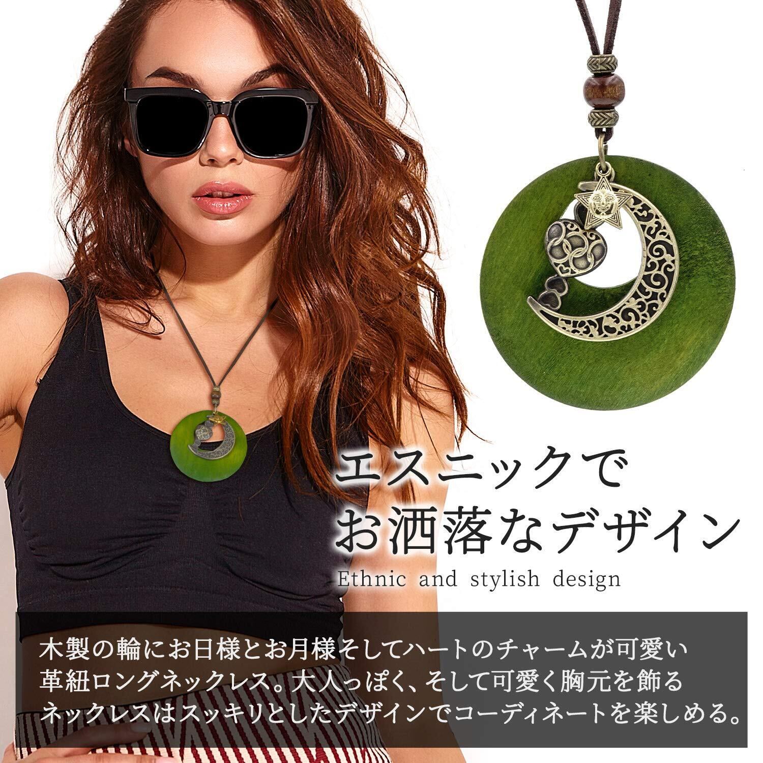 【商品について】木製の輪にお日様とお月様そしてハートのチャームが可愛い革紐ロングネックレスです。スッキリとしたデザインでどんな服装にも合います。お出かけ時のワンポイントとしてお使いください。