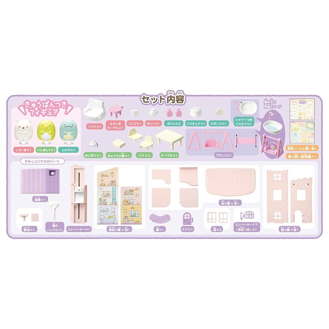 【セット内容】しろくまエレベーターのすみっコハウス(1),橋(1),ドア(1),エレベータードア(支柱つき)(1),テーブル(1),イス(2),きゅうりの箱(1),おにぎり(1),シャワーつきバスタブ(1),バスチェア(1),ボトル(2),スポンジ(1),ソファ(1),コップ(1),ポット(1),ふろしきテーブル(1),ブランコ(1),しろくま(1),とかげ(1),ぺんぎん?(1),専用シール(2),取扱説明書(1),