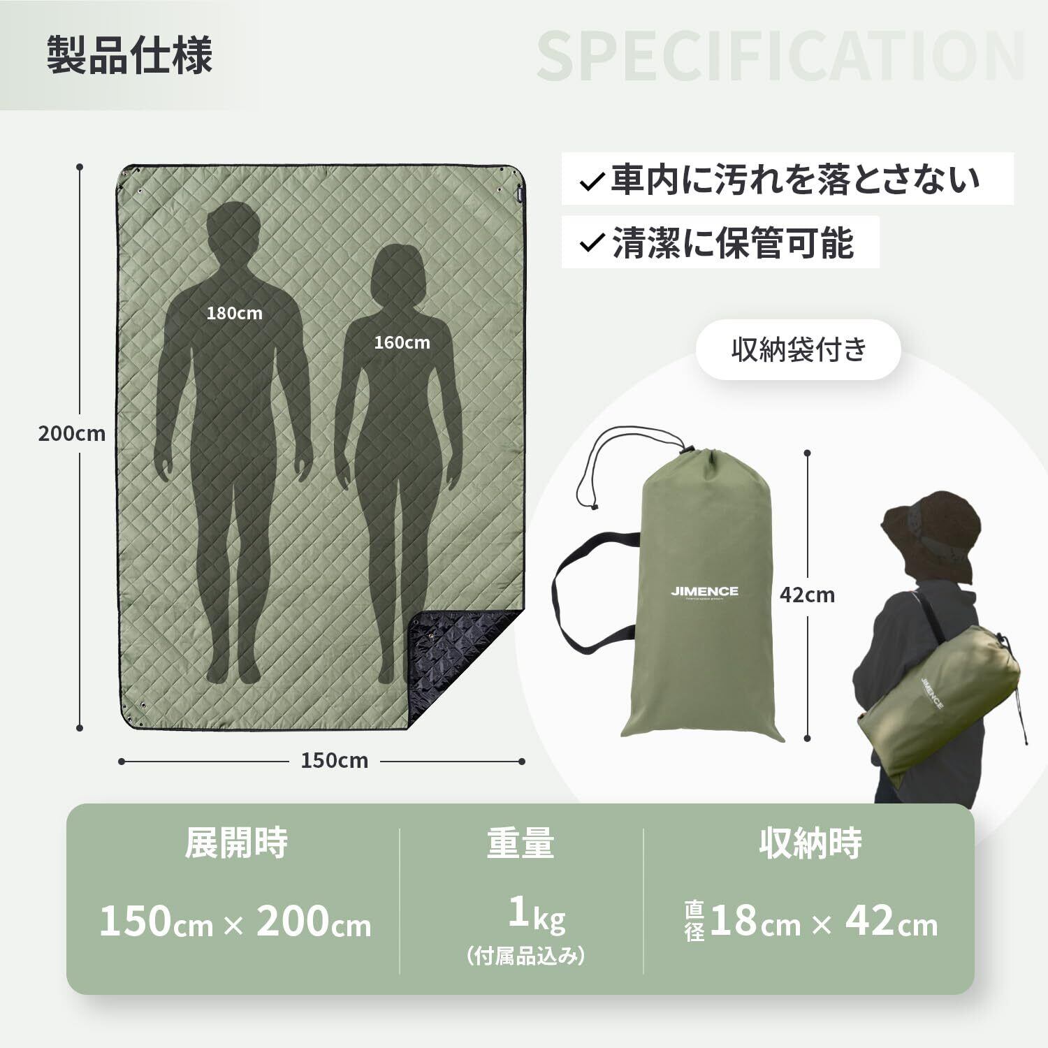 JIMENCE(ジーメンス) レジャーシート 厚手 防水 収納袋付き 1~3人用 200×150cm キャンプマット (グリーン)