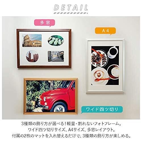 色名:ナチュラル ■モダンな絵と木目調のモールが飾った部屋を落ち着かせます■2枚のマットを使い分けば写真を飾るアレンジが増えます■落ち着きのある2色の色合いで飾る写真を演出します■いつも身近に置いても、飽きのこないシンプルでスリムなデザイン、そして、壁にやさしい軽量フレームにこだわりました■ワイド4切とA4サイズマットと多窓マット使用で3種類の兼用フレームができます●外寸:W284×H398×D18mm●内寸:W256×H368×D18mm●マット窓寸:A4サイズ/W200×H283mm、多窓(4窓)/L×2(W117×H79mm)、KG(W142×H92mm)、楕円(W92×H92mm)●質量:約520g●面材:PET●付属品:吊り紐・取扱説明書
