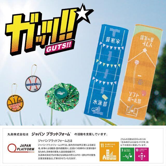 通常のフェイスタオルより大判サイズでお風呂上りやスポーツ時など肩から羽織って日よけとしても使用できます。 黄色ブドウ球菌や肺炎桿菌などの人体に有害な細菌の増殖を抑え、清潔に保つ制菌加工付きです。【ガッツ】部活動をテーマに作られた丸眞株式会社オリジナルブランド。ユニークでダサ可愛いデザインがポイントです。部活仲間とお揃いで持ったり、応援グッズやプレゼントとしてもぴったりです。【JAPAN PLATFORM/ジャパンプラットフォーム】国内外の自然災害による被害者、紛争による難民・国内避難民に、迅速かつ効果的に支援を届けるための、緊急人道支援組織です。丸眞株式会社では、対象となる商品の売上の一部を、JPFの緊急災害支援基金として寄付させていただきます。