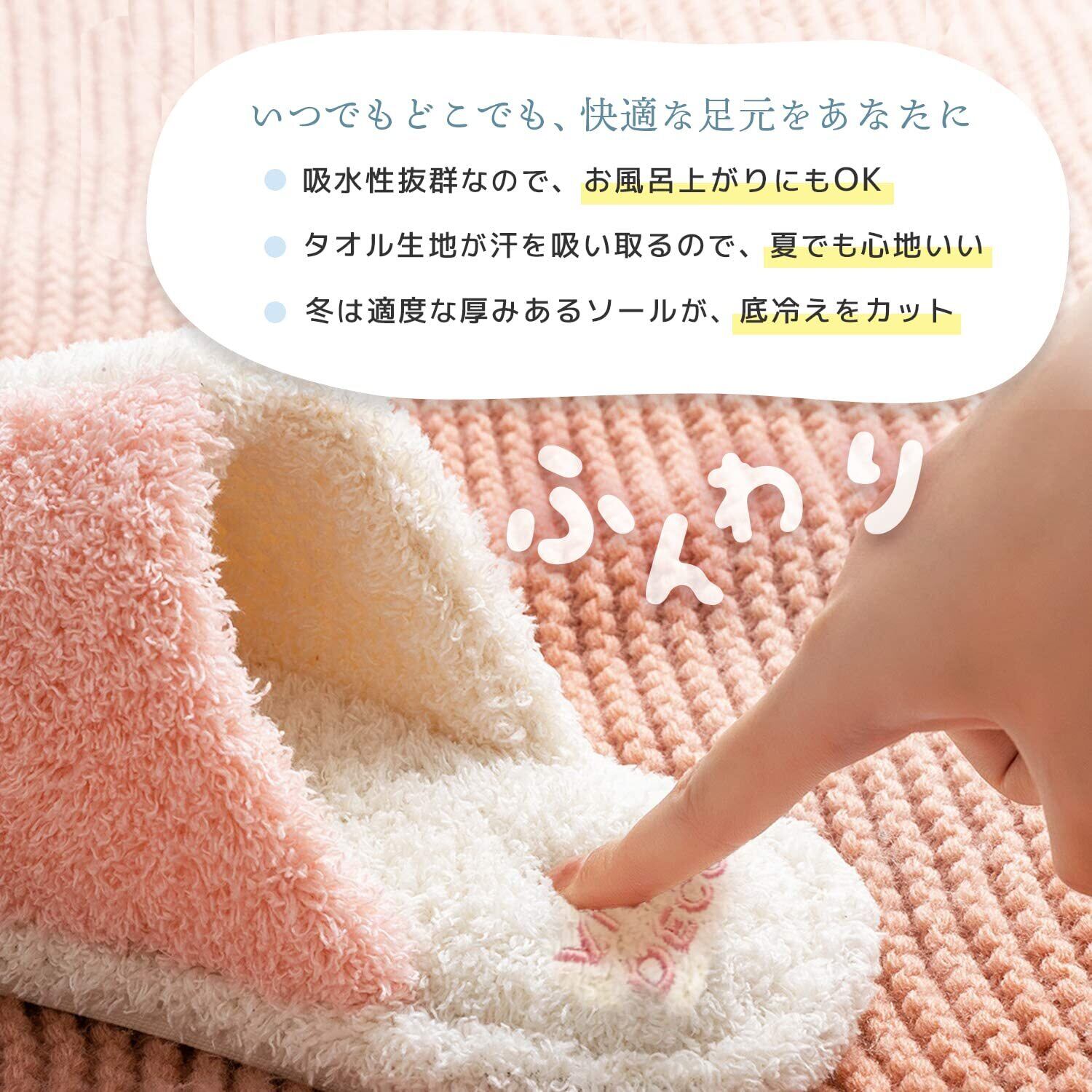 タオル地だから洗濯可能でいつも洗いたてで清潔に使えます。タオルが汗を吸い取り、素足で履いてもいつもさらさらで夏でも心地よくオールシーズン履ける夏用でも冬用でも快適ルームシューズ。