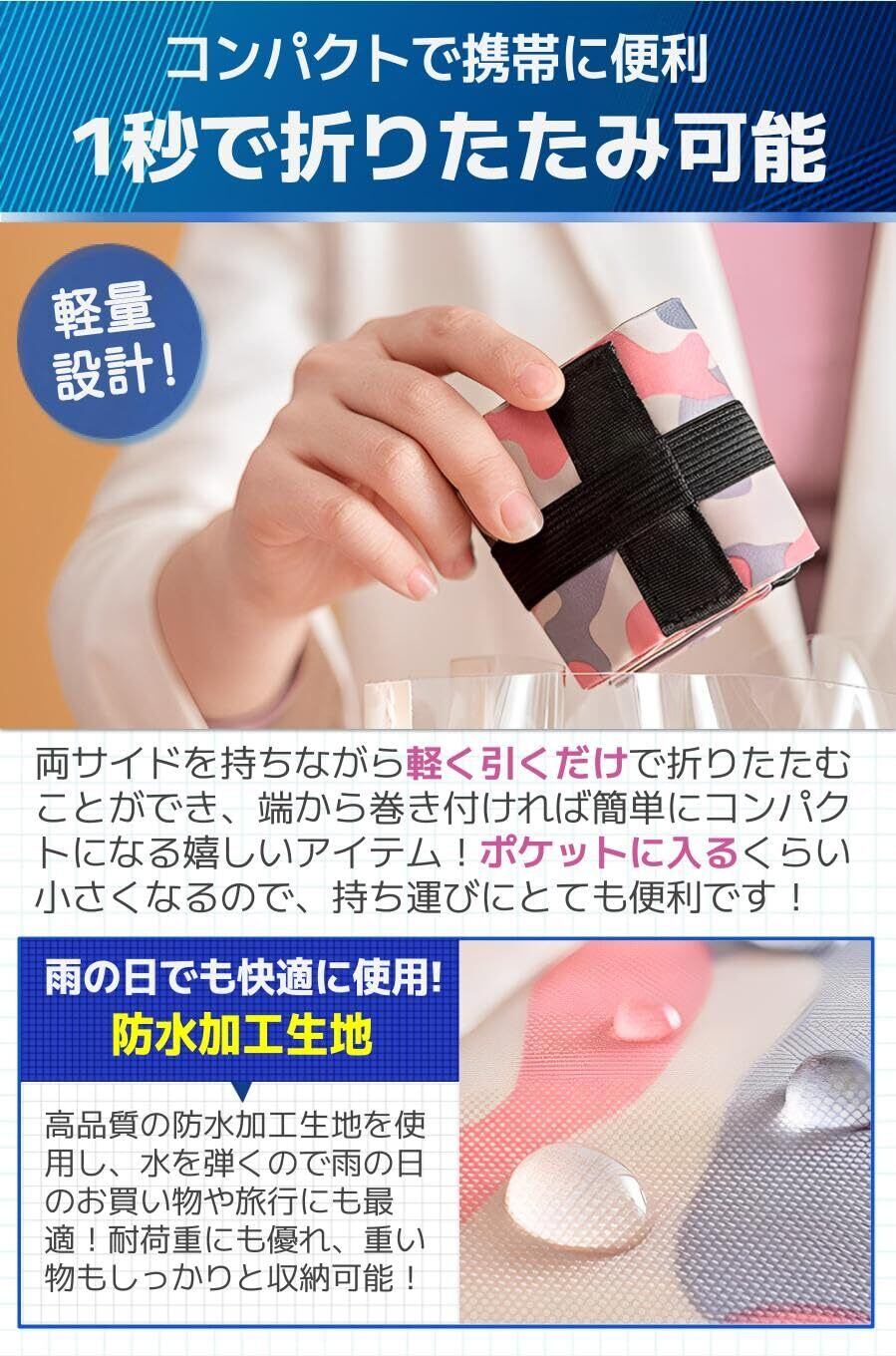 【防水加工生地】高品質の防水加工生地を使用し、水を弾くので雨の日のお買い物や旅行にも最適!耐荷重にも優れ、重い物もしっかりと収納可能!