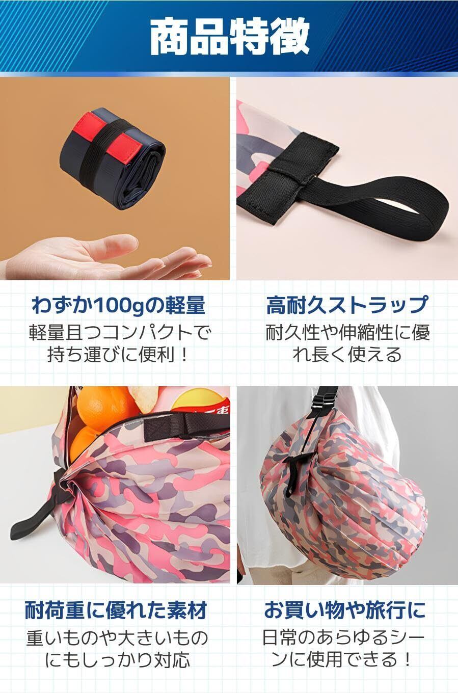 【商品特徴】①わずか100gの軽量:軽量且つコンパクトで持ち運びに便利!/②高耐久ストラップ:耐久性や伸縮性に優れ長く使える/③耐荷重に優れた素材:重いものや大きいものにもしっかり対応/④お買い物や旅行に:日常のあらゆるシーンに使用できる!