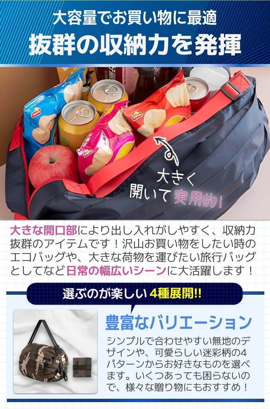【抜群の収納力を発揮】大きな開口部により出し入れがしやすく、収納力抜群のアイテムです!沢山お買い物をしたい時のエコバッグや、大きな荷物を運びたい旅行バッグとしてなど日常の幅広いシーンに大活躍します!