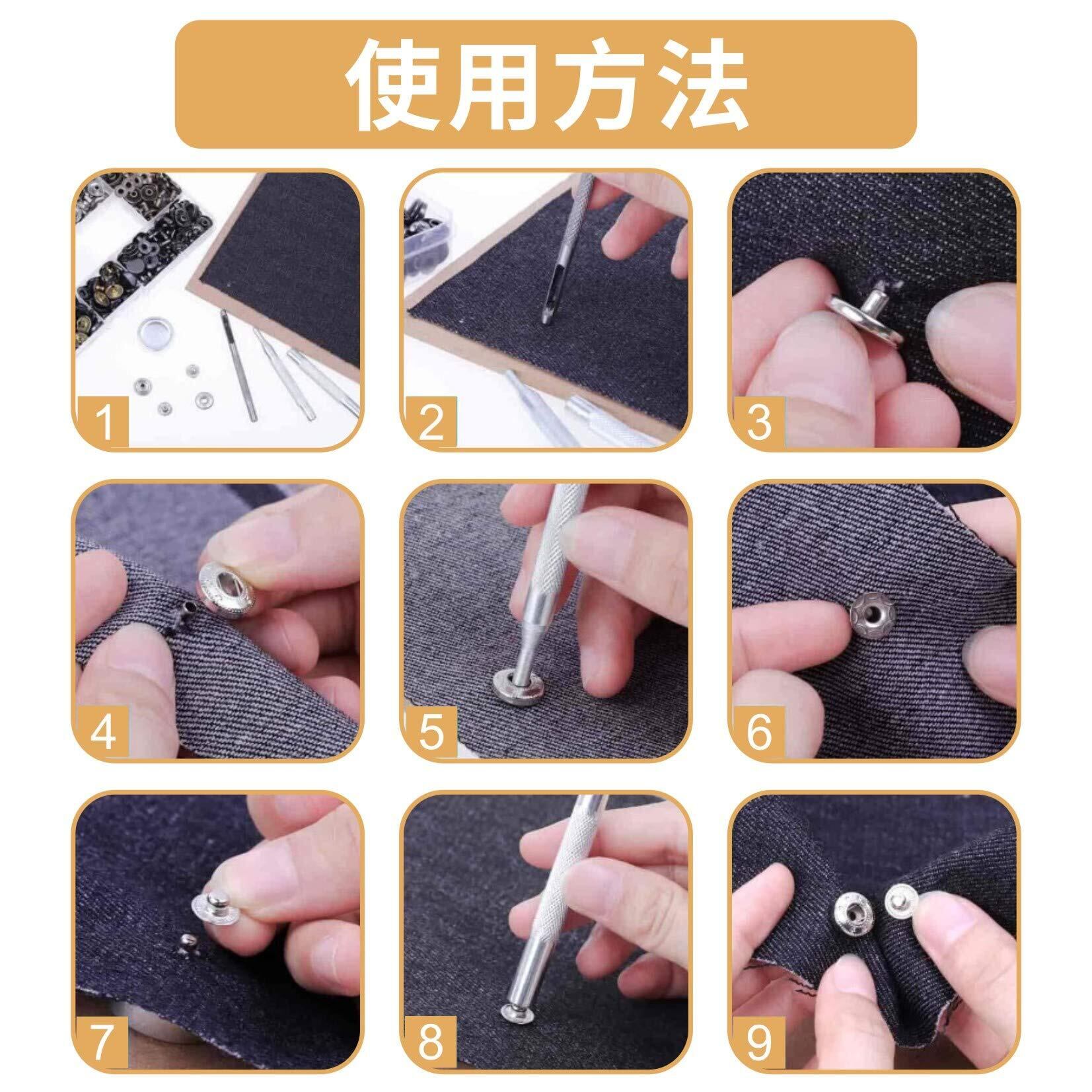 【DIY・手芸・ハンドメイドに適用】かばんやアクセサリー、財布、キーケース、サンダル等様々なホックの取付作業に必須の定番セットになります。大活躍な手芸材料セット、素敵なハンドメイド作品の仕上げに大いに役立ち間違いありません。DIY好きな方にお勧めです。