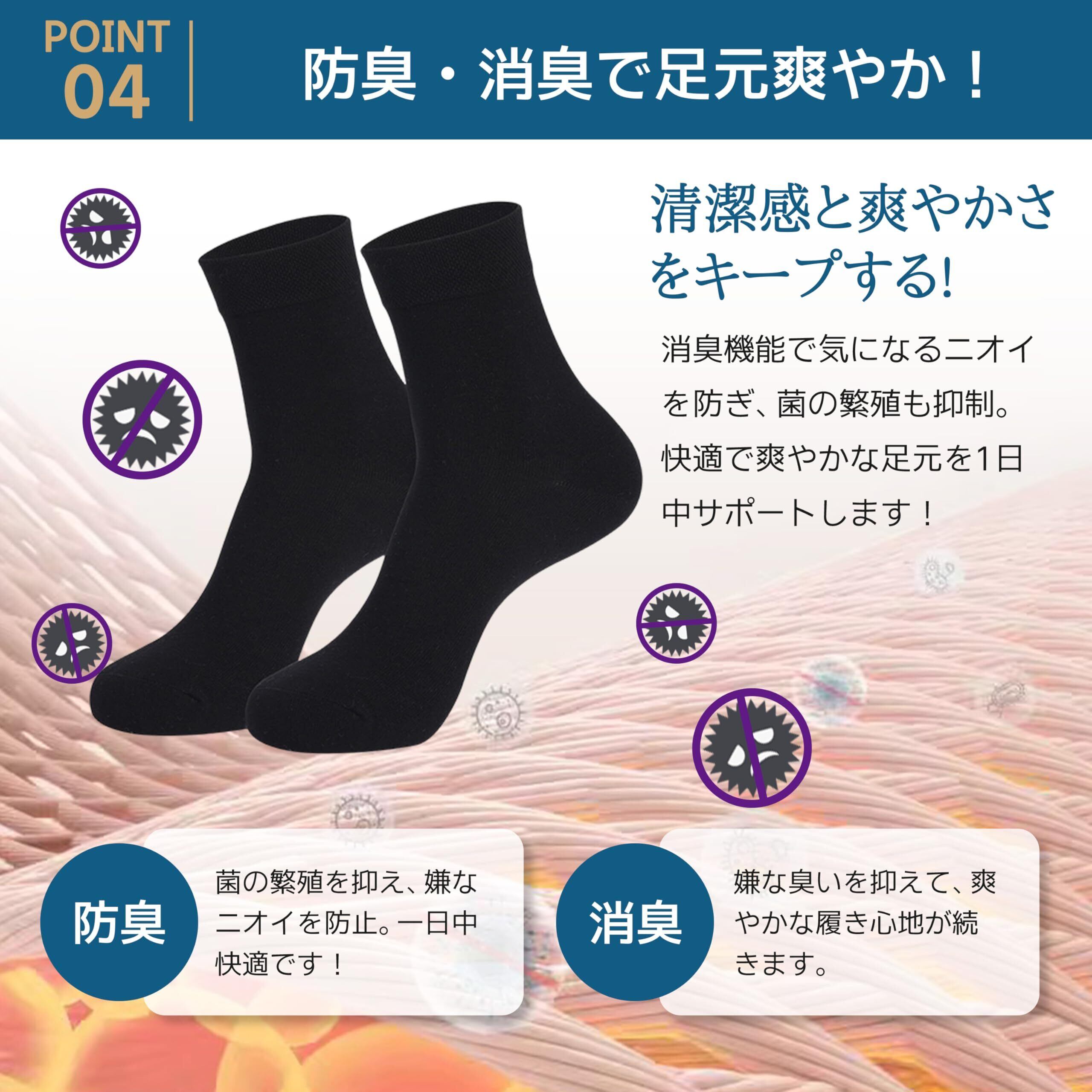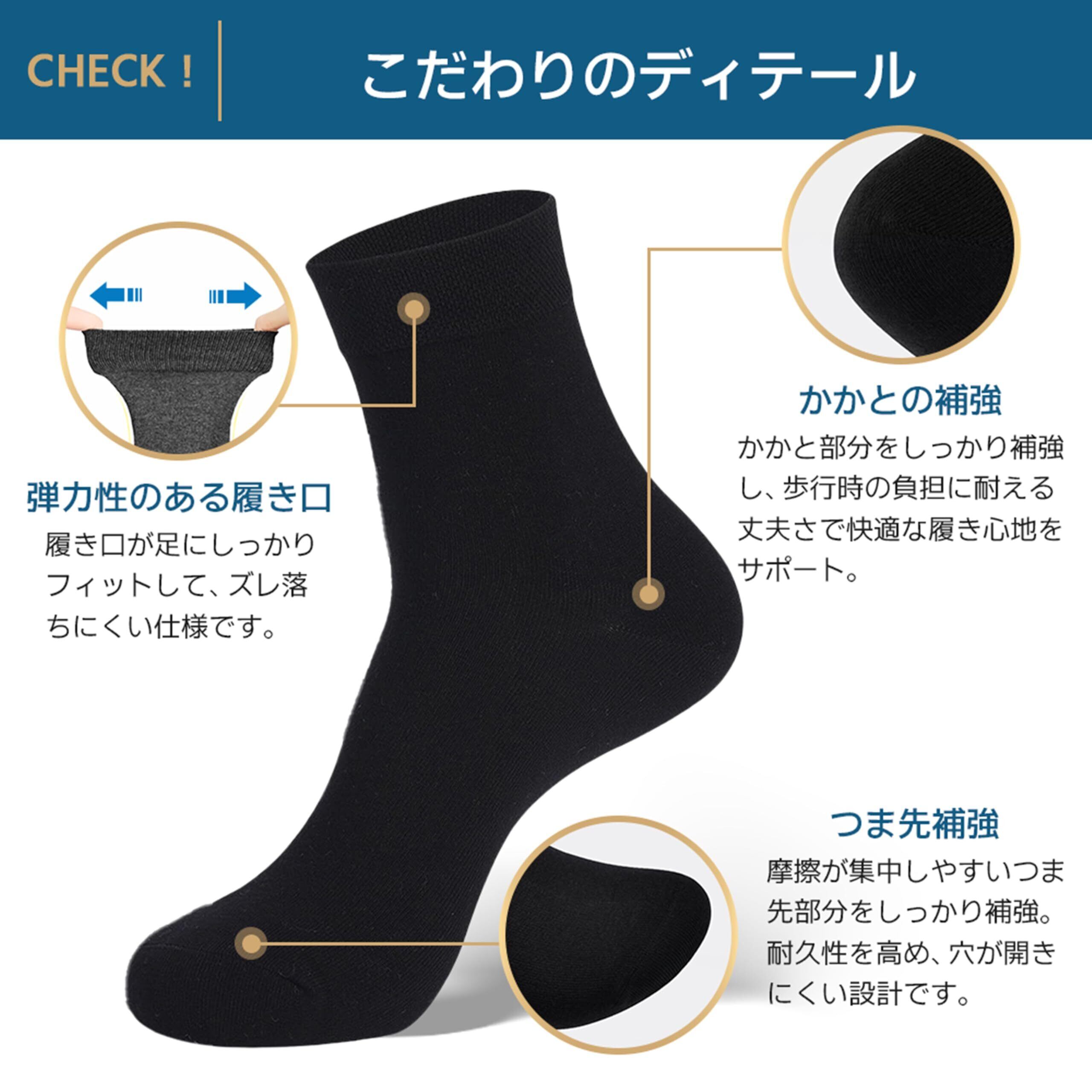 【サイズ】ミドル丈:24.5~27cm、ロング丈:25~27.5cmに対応。 【一年中快適な履き心地】 肌触りが良く、吸汗性、吸湿性、吸水性と通気性に優れた中厚手の生地を使用したオールシーズン対応のメンズ靴下です。厚すぎず薄すぎない絶妙な素材感で、春夏秋冬どの季節でも快適に履けます。靴の中でムレにくく、一日中足元を爽やかに保ちます。