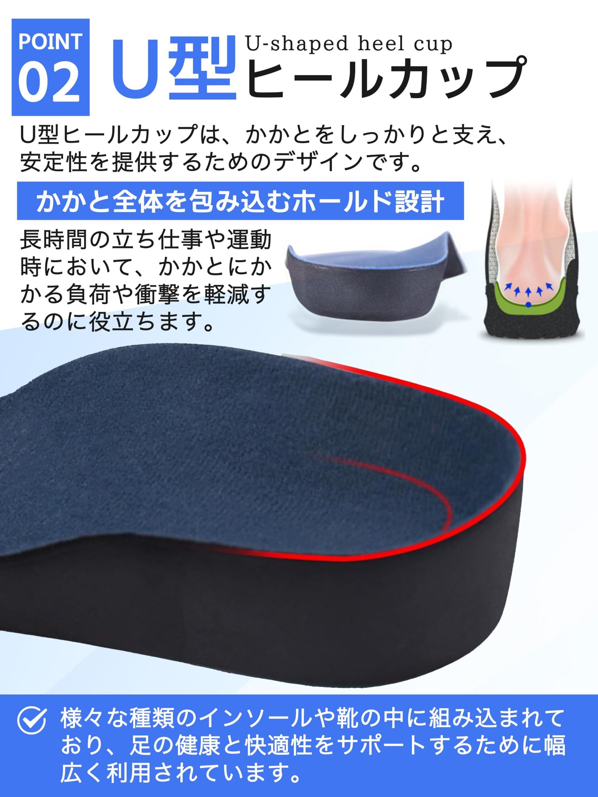 【扁平足対策】扁平足は内側縦アーチ構造が崩れることで発生します。足を受けた衝撃を吸収しにくくなるので足が疲れやすくなります。深いU型のヒールカップはかかとをしっかりホールドし、踵の安定性を高め、足や靴の間の摩擦を減らしながら、外側に体重かからないよう横滑り防止できます