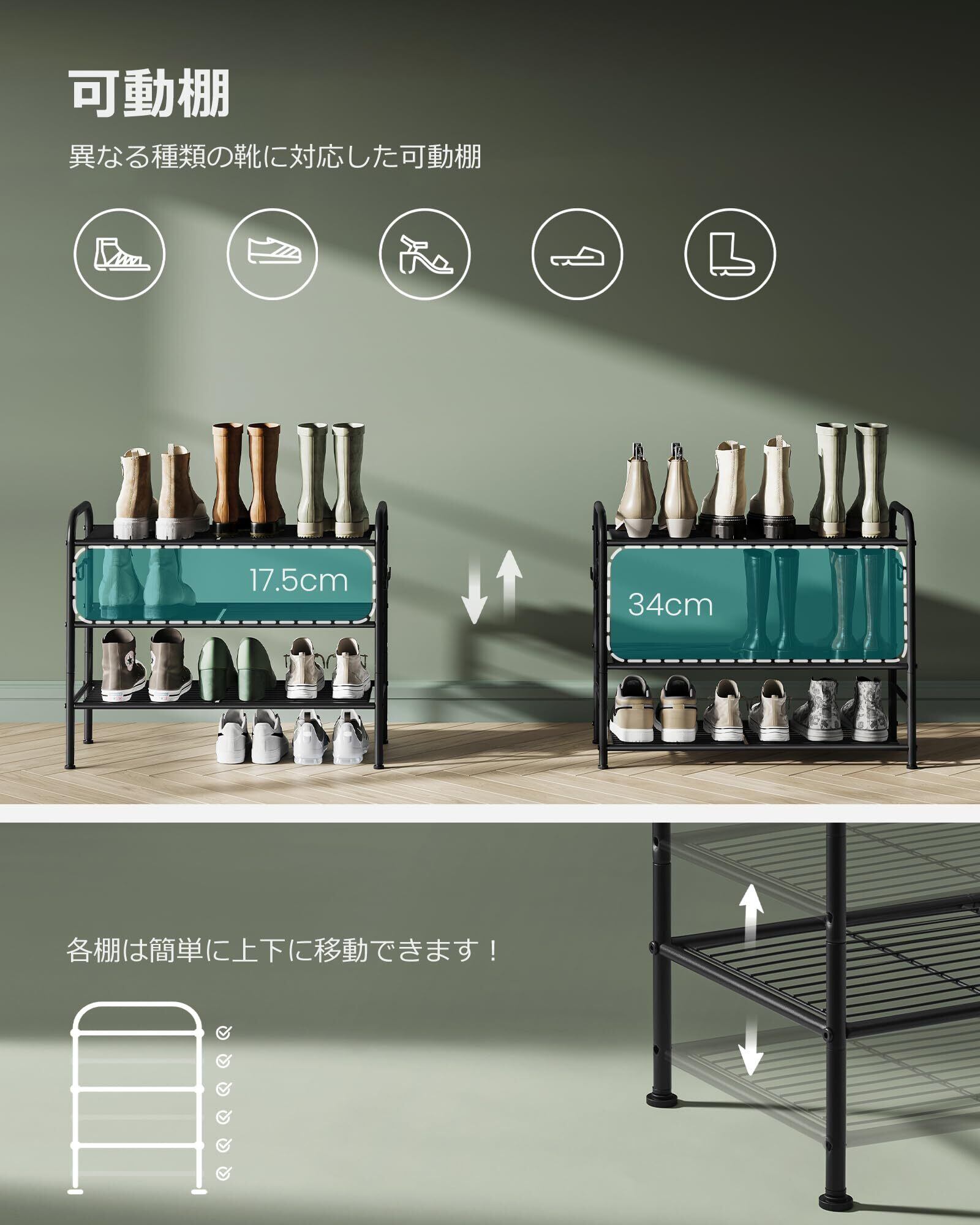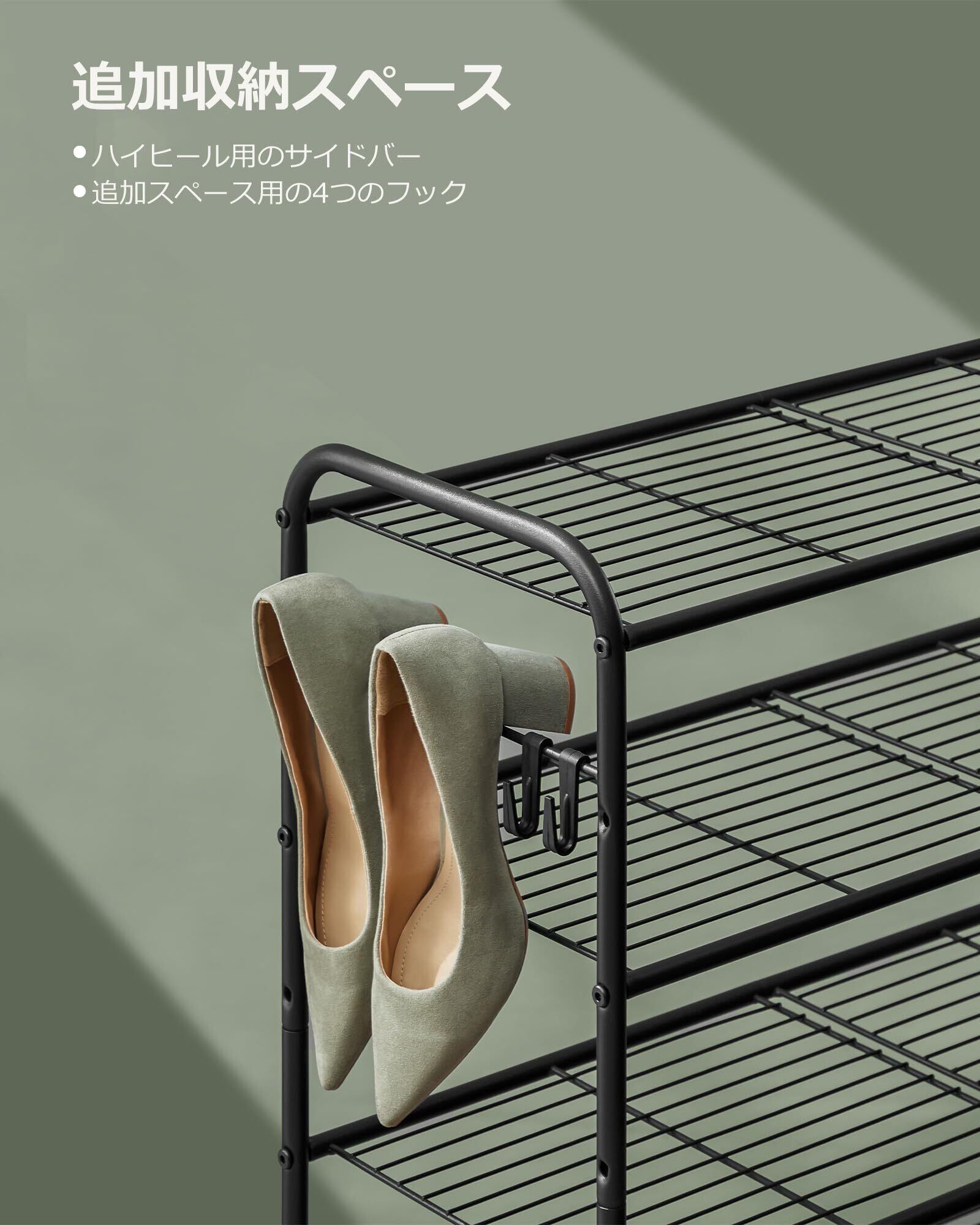 【靴の簡単な収納】 この調整可能なメタルシェルフの各層は、快適に3〜4足の靴を収納するのに十分な広さがあります。お気に入りの靴に簡単にアクセスし、きちんと収納出来ます!