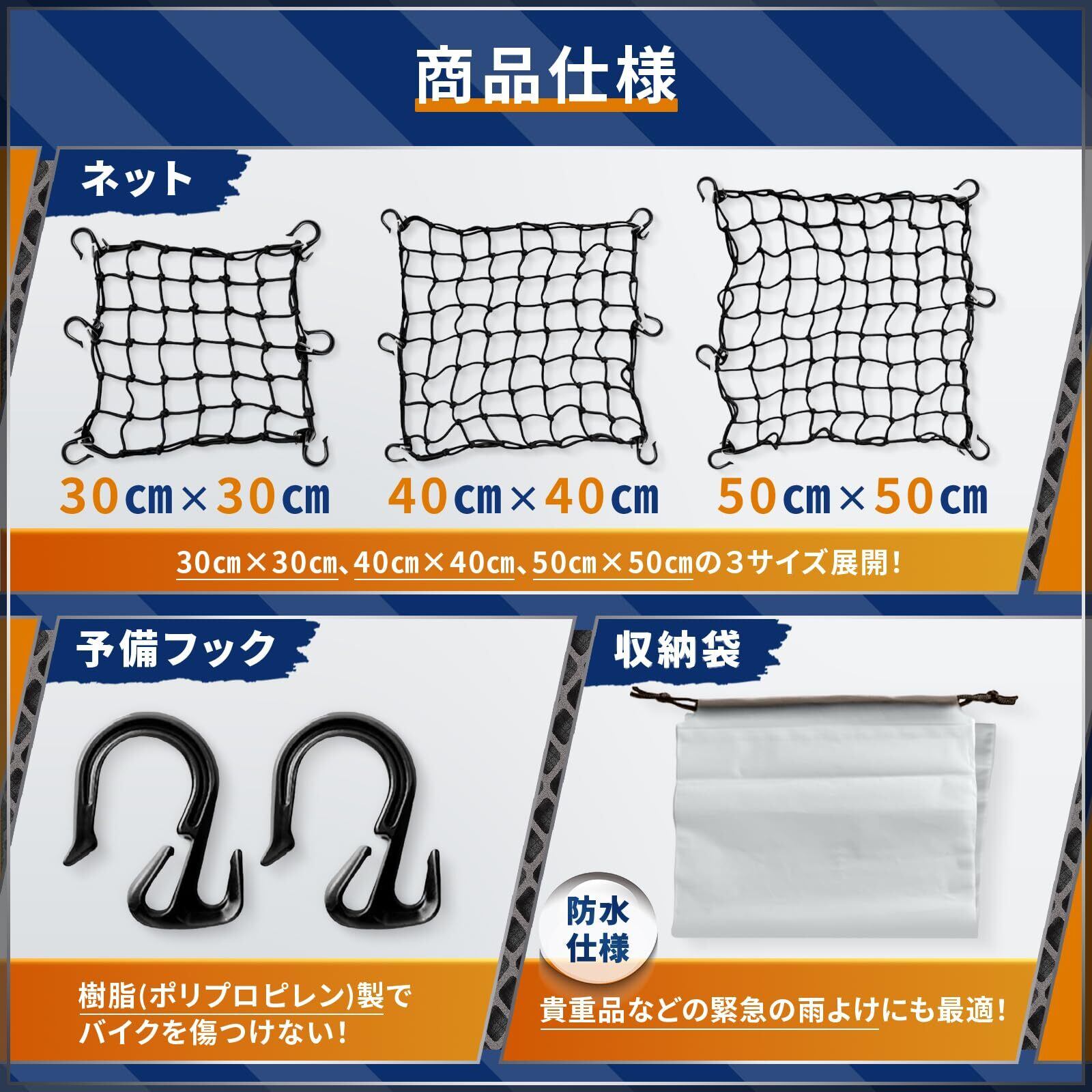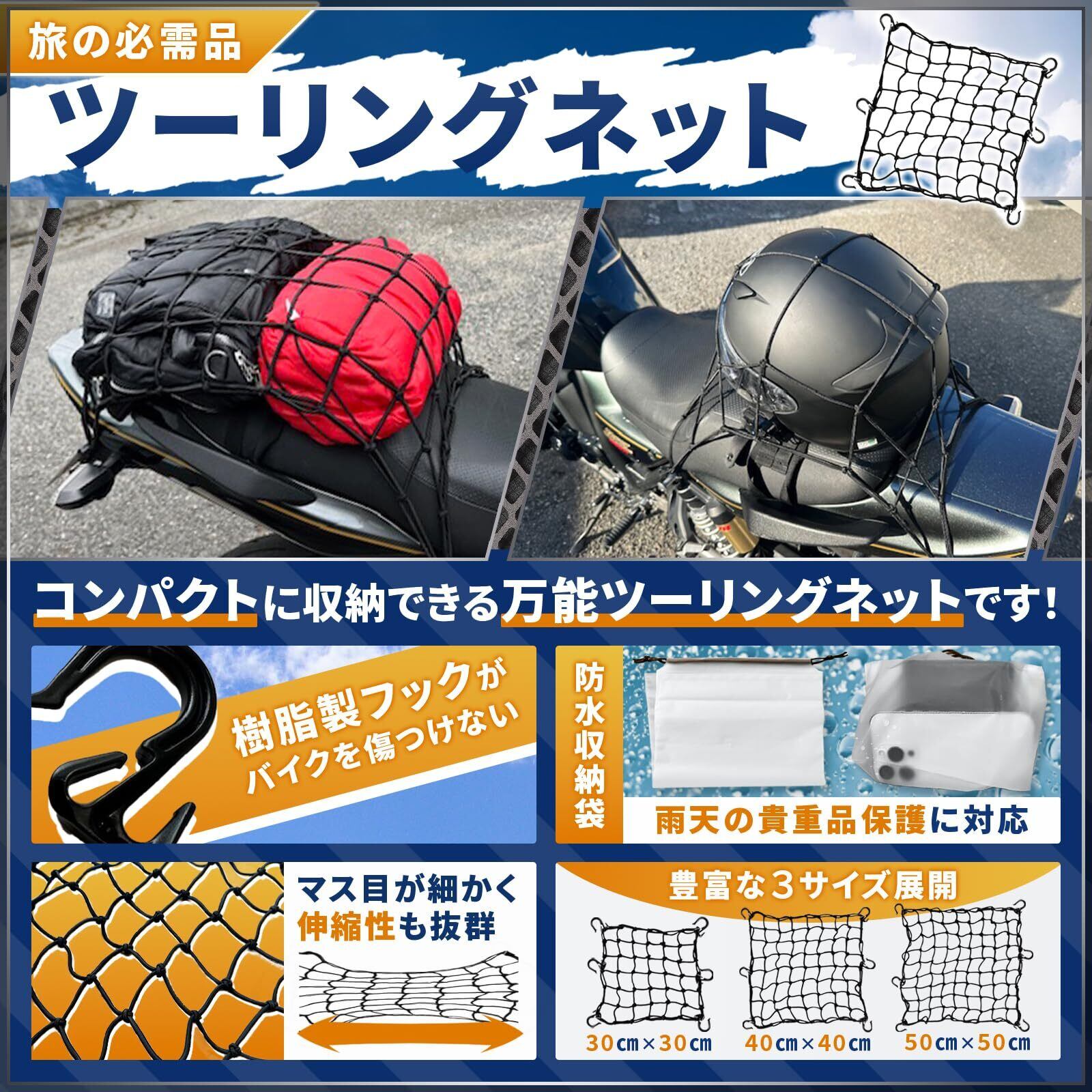 【走りに自由を】 MOTOFORTABLE ツーリングネット バイクネット バイク 荷物 ツーリング キャンプ 荷崩れ防止 予備フック2個付属 防水収納袋 3サイズ(50cm×50cm)