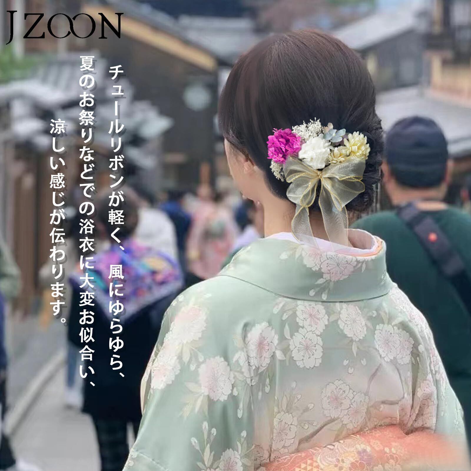 【使用場面多様】チュールリボンが軽く、風にゆらゆら、花もたくさん咲いている夏のお祭りにピッタリする一品です。もちろん、結婚式、卒業式、成人式、コスプレなどでの和服や洋服にもおススメです。小花がお好きな位置につけられ、リボンが立体的で、髪の長さやヘアスタイルに合わせて、お花の真ん中に付けるのも、サイドに付けるのも美しく仕上げられます。