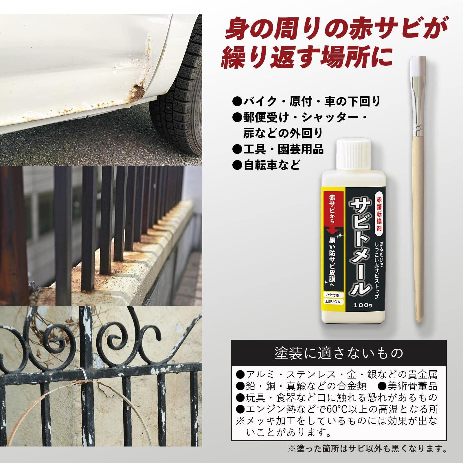 コモライフ 赤錆転換剤 サビトメール (約100g) 錆転換剤 防錆剤 防錆 赤サビ転換剤 錆止め 塗料 赤錆 黒錆 サビ取り不要 赤錆を黒錆に変える 防錆下地 ハケ付き 上塗りOK 塗るだけ 水性 油性 補修 自転車 車 バイク 【日本製】