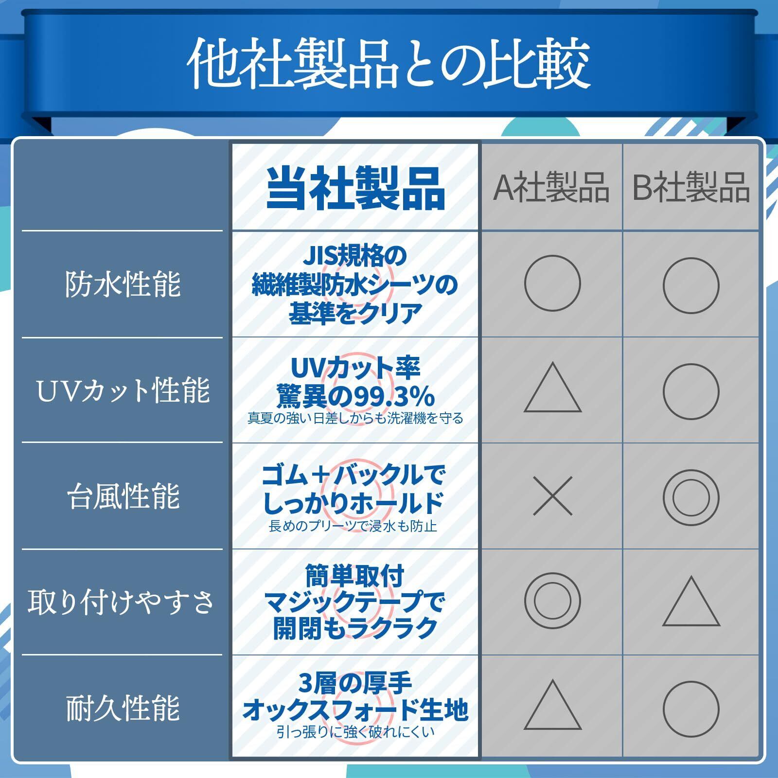 【雨濡れと日焼けから守る】 本製品は検査機関にて性能の試験を実施しております。 防水性能については耐水度が357mmあり、繊維製防水シーツの基準をクリアした素材で高い防水性能があります。UVカット率は99.3%とほとんどの紫外線をカットすることができ日焼けによる洗濯機の劣化を防ぐことができます。