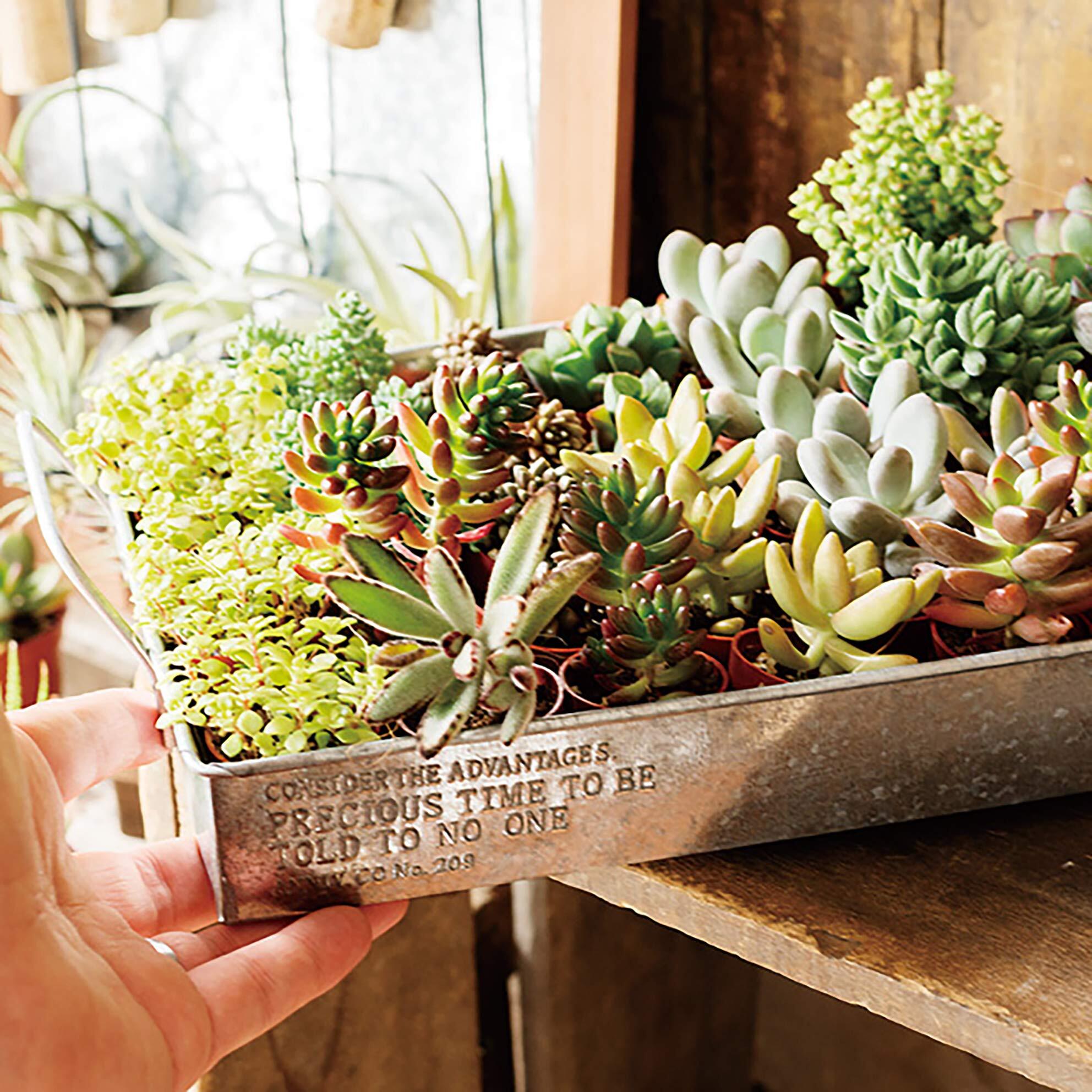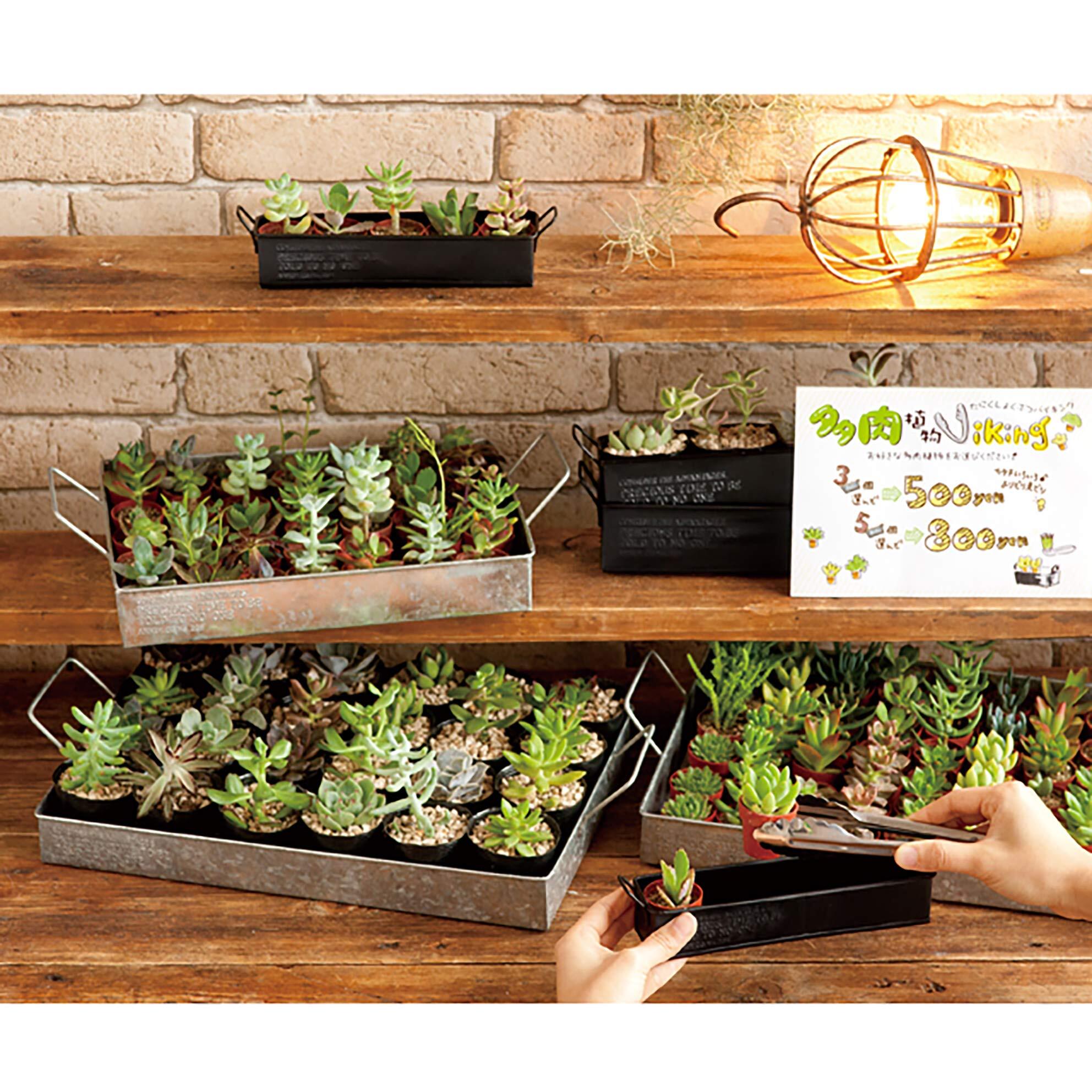 ロゴデザインが側面に型押しされています。店舗什器にも、ガーデニング用品としてもご活用いただけます。素のままのブリキがクールなアイテムです。
