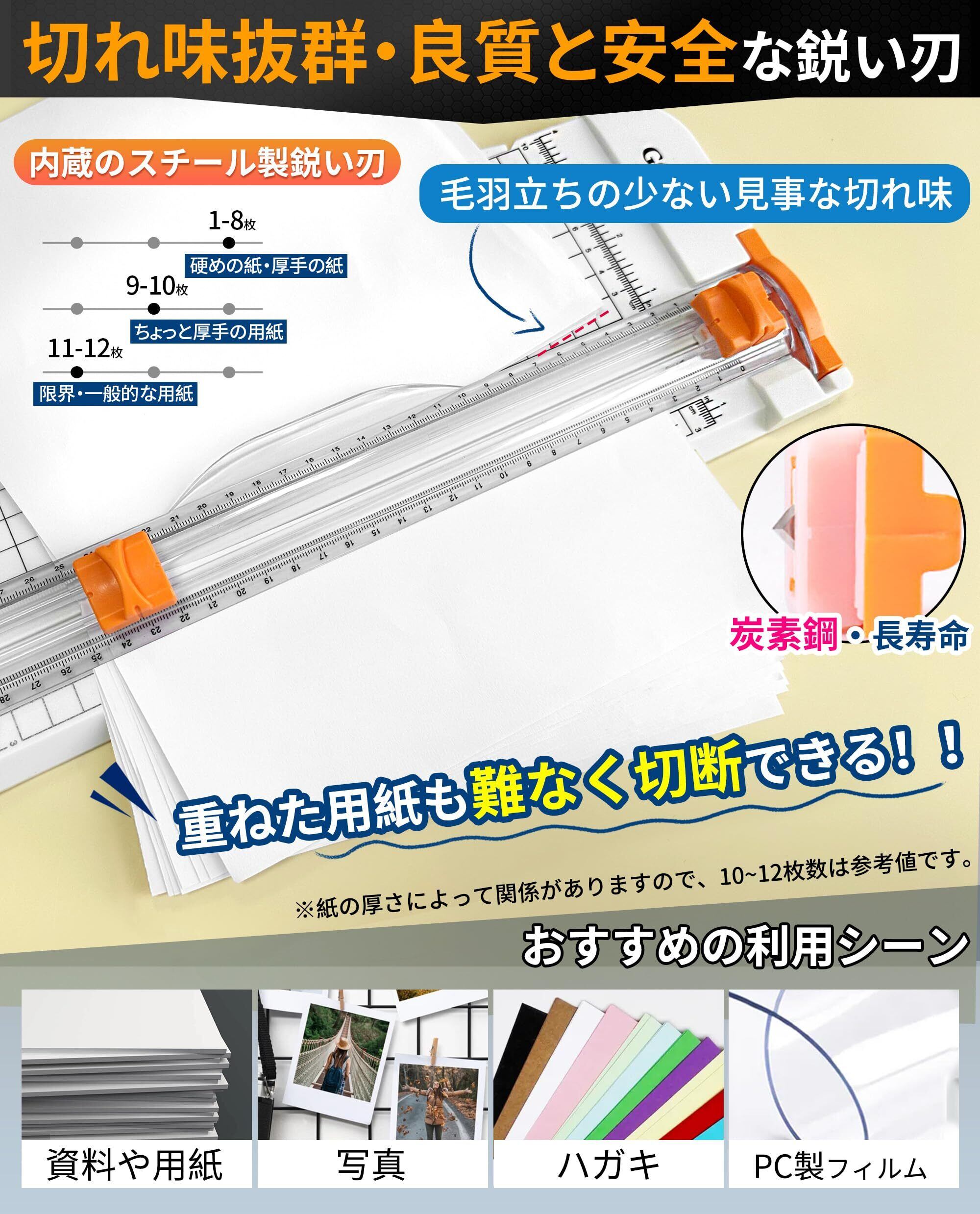 【使い方は簡単】透明の紙押さえ板でカットしたい紙を挟み、スライダーを下までスッとおろすだけ!家庭、オフィス、プリントショップ、DIYに適しています。硬いボール、カード、写真などを裁断できます。自宅やオフィスでも活躍するアイテム。資料や用紙の裁断、事務作業などにとっても便利です。※裁断できないもの:湿った紙、薄い紙(和紙、ティッシュペーパー) クリップ、ホッチキス、粘着剤などがついた紙。