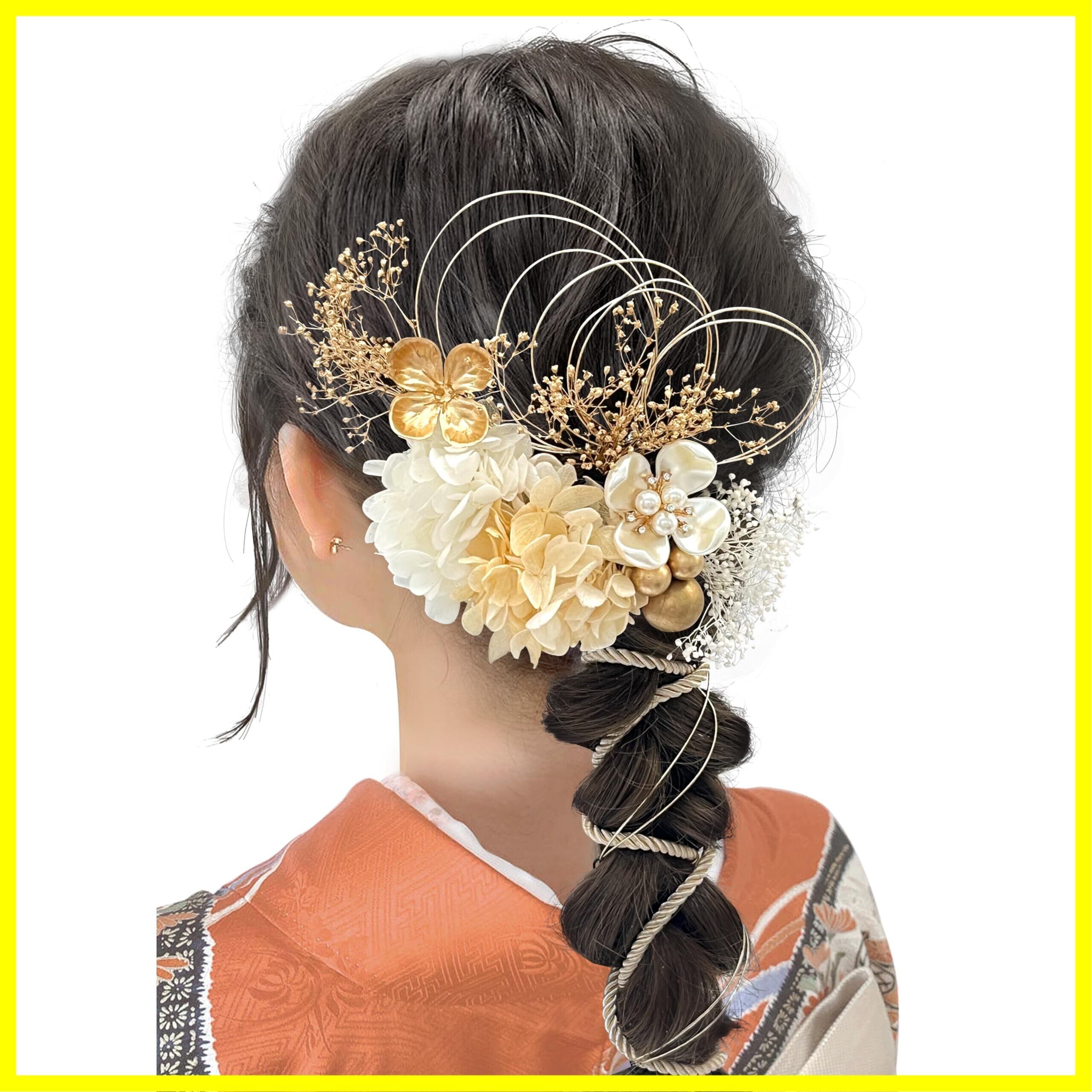 【華麗なデザイン】自然の美しさと華やかさが見事に融合したこの髪飾りセットは、あじさいやかすみ草、水引、パール、そして美しい組紐など、上質な素材を贅沢に使用しています。本物の素材ならではの上品な輝きが特別な日を彩り、優雅で洗練された雰囲気を演出します。人生の節目となるイベントや、思い出に残るひとときを、さらに魅力的に仕上げてくれる一品です。