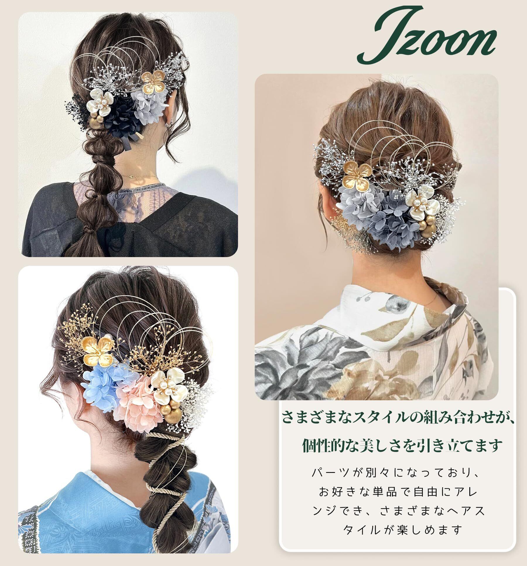 この髪飾りセットは、あじさいやかすみ草、水引、パール、組紐などの上質な素材が使用されており、自然の美しさと華やかさを見事に融合させたアイテムです。職人が一つ一つ丁寧に仕上げたデザインは、本物の花の魅力を最大限に引き出し、唯一無二の優雅さを演出し、特別な日の装いにエレガントな輝きを添えます。軽量で装着も簡単なUピンやIピン仕様なので、初心者でも気軽にお使いいただけます。17点のセットは各パーツを自由に組み合わせられ、自分だけのアレンジが楽しめるのも魅力です。和装や振袖、浴衣にぴったりで、成人式や卒業式、結婚式など特別なイベントに最適。また、自分へのご褒美や大切な人への贈り物としても喜ばれること間違いなしです。